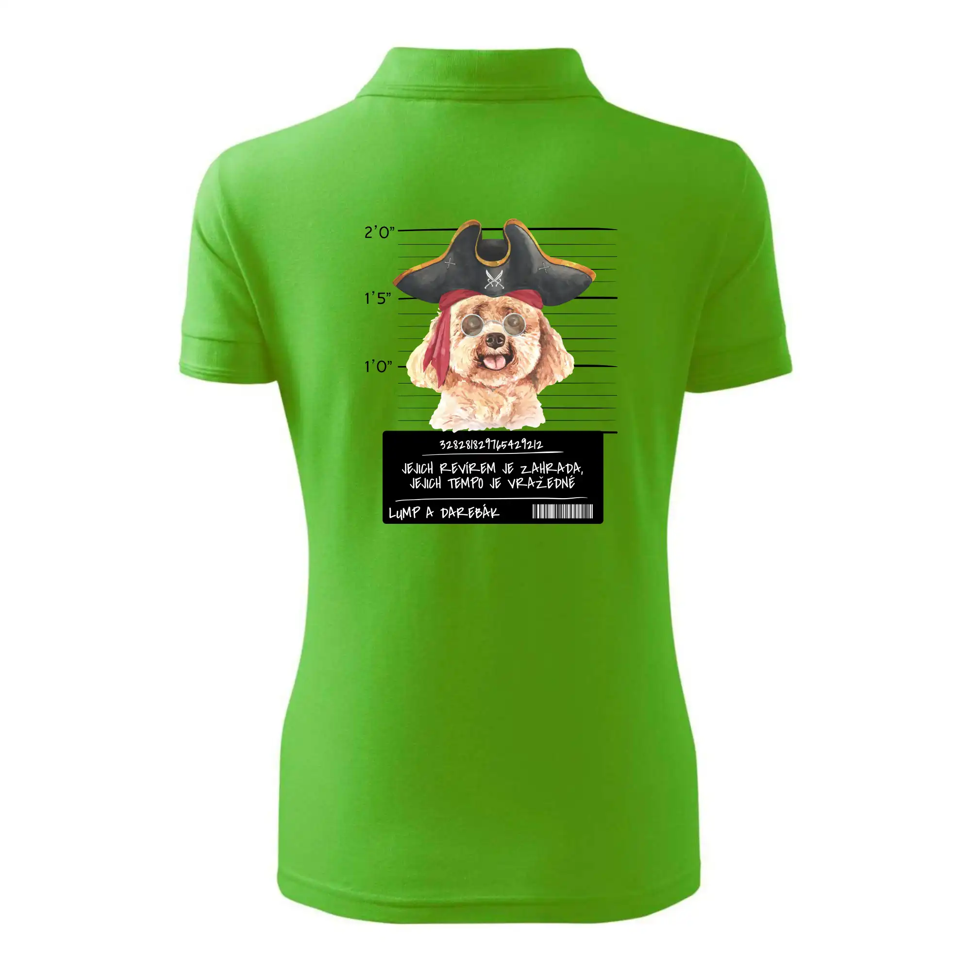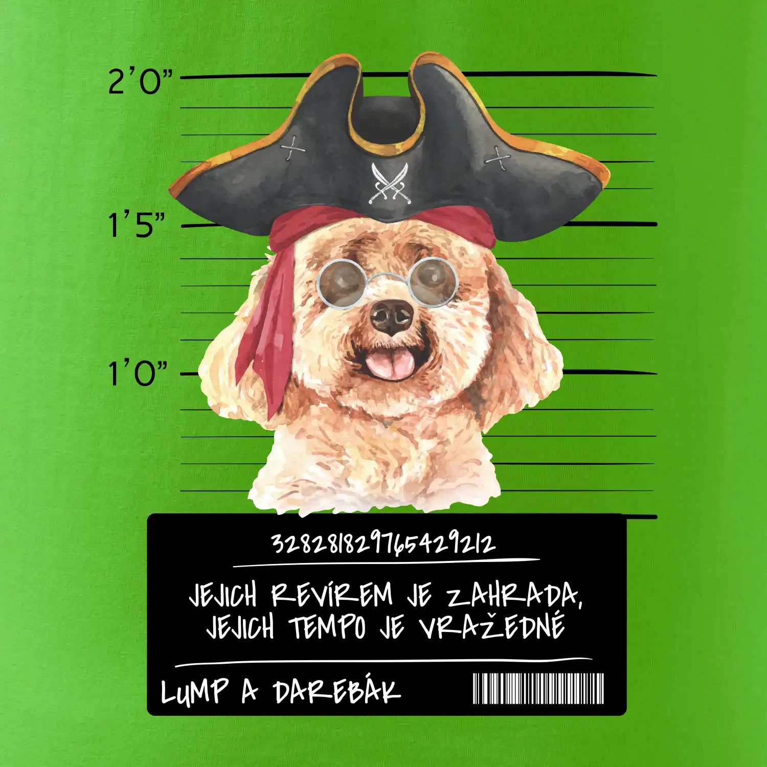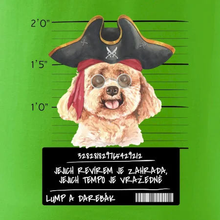 Triko pro pejskaře s nápisem "Jejich revírem je zahrada, jejich tempo je vražedné, lump a darebák". Triko, na kterém je pirát pes pudl, by měl doma mít každý správný pejskař. Triko se psem je vhodný dárek pro pejskaře.