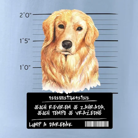 Triko pro pejskaře s nápisem "Jejich revírem je zahrada, jejich tempo je vražedné, lump a darebák". Triko, na kterém je pes zlatý retrívr, by měl doma mít každý správný pejskař. Triko se psem je vhodný dárek pro pejskaře.