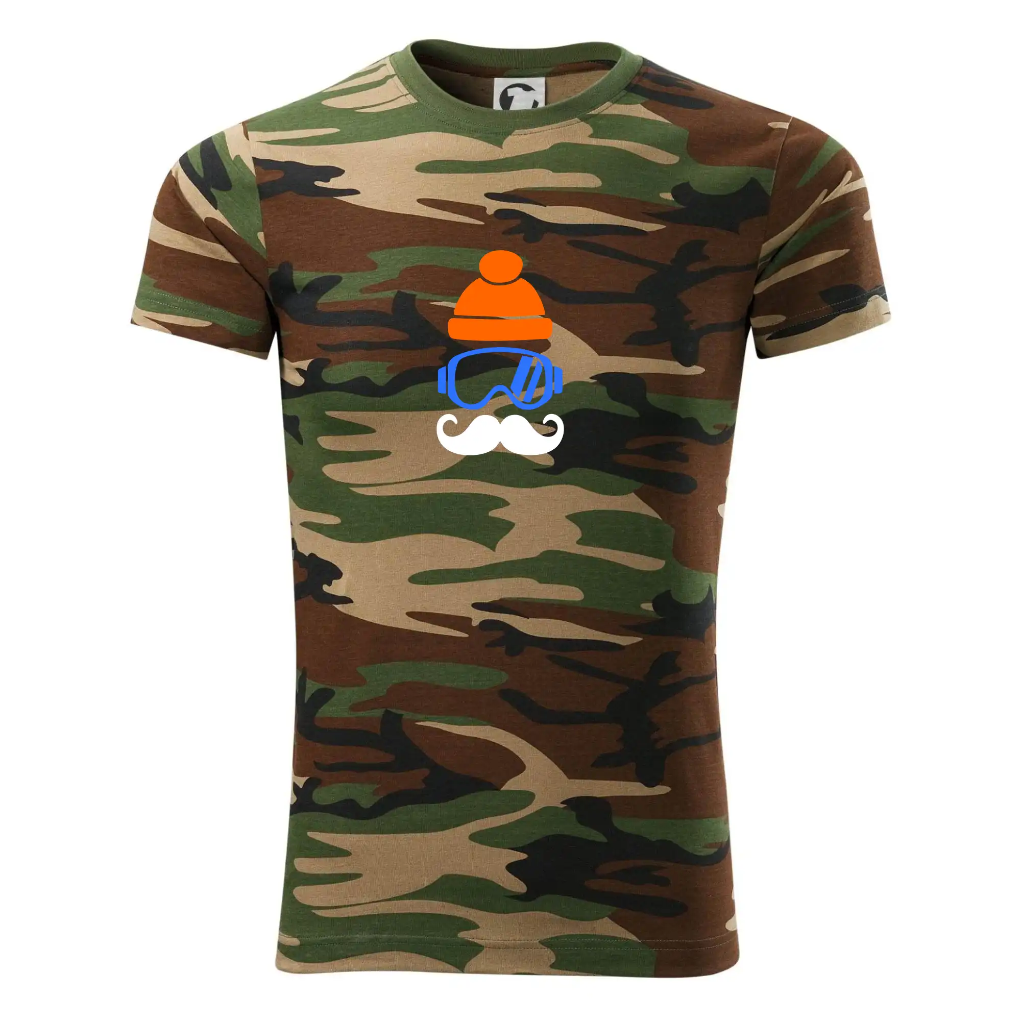 Tričko střední gramáže v barvách camouflage. Střih s bočními švy. Lem průkrčníku ze žebrového úpletu s přídavkem 5 % elastanu. Vnitřní část zadního průkrčníku začištěna páskou v barvě camouflage.