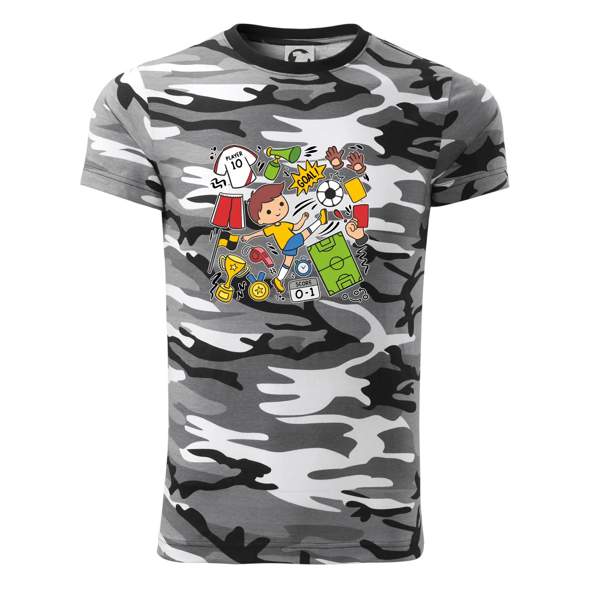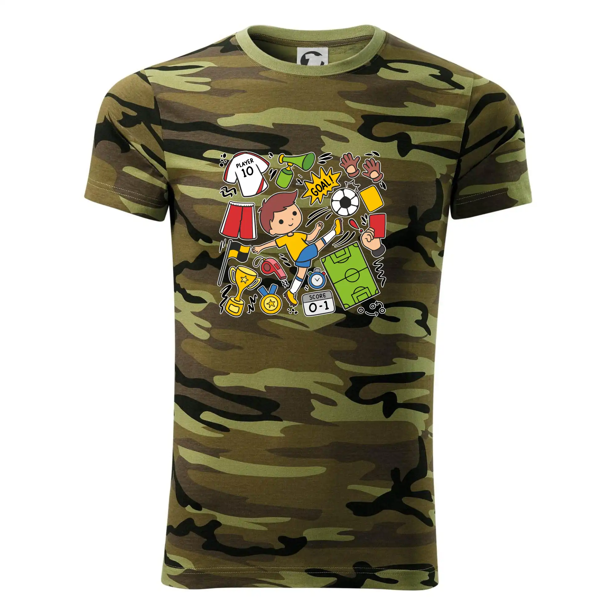 Tričko střední gramáže v barvách camouflage. Střih s bočními švy. Lem průkrčníku ze žebrového úpletu s přídavkem 5 % elastanu. Vnitřní část zadního průkrčníku začištěna páskou v barvě camouflage.