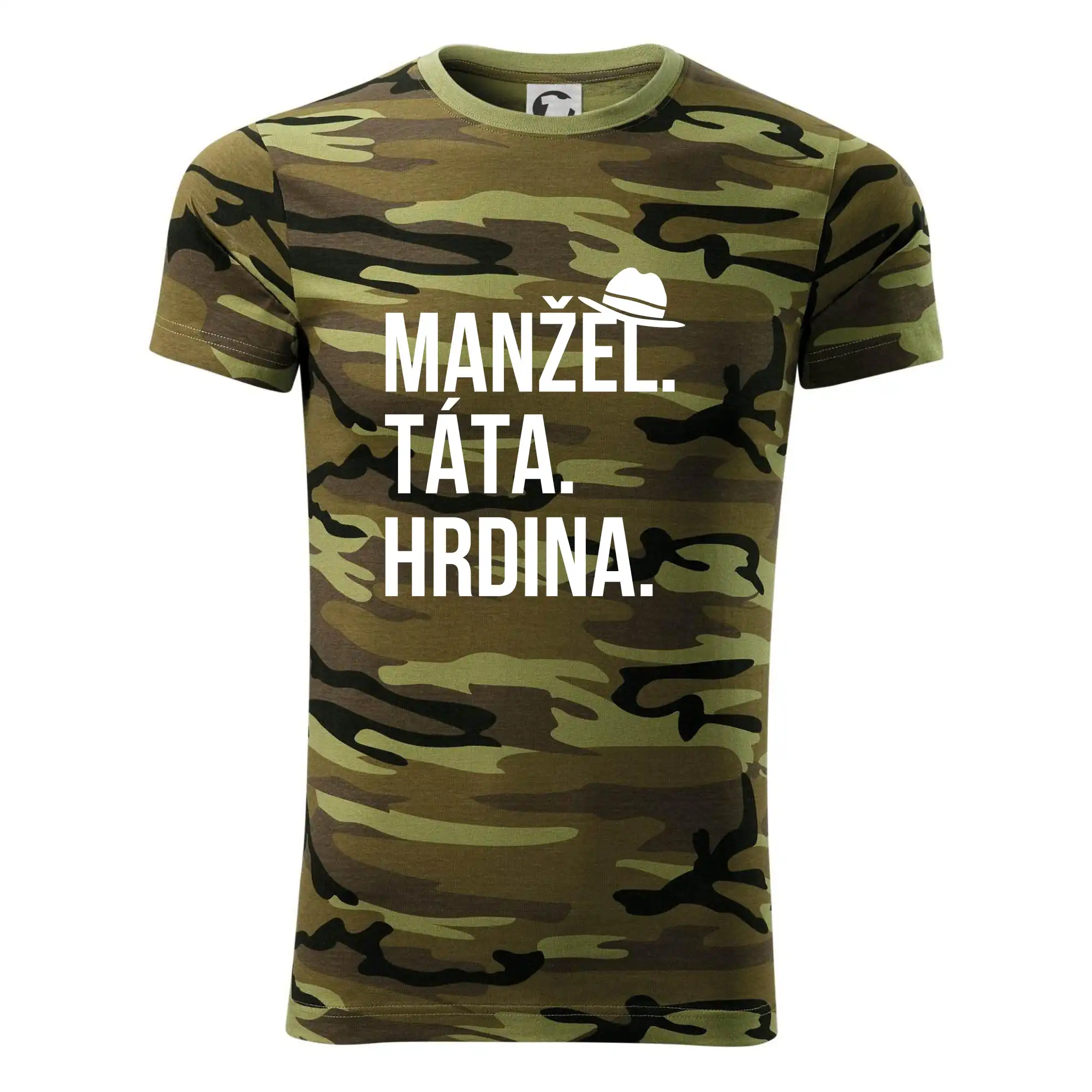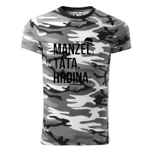 Tričko střední gramáže v barvách camouflage. Střih s bočními švy. Lem průkrčníku ze žebrového úpletu s přídavkem 5 % elastanu. Vnitřní část zadního průkrčníku začištěna páskou v barvě camouflage.