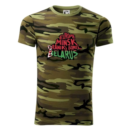Tričko střední gramáže v barvách camouflage. Střih s bočními švy. Lem průkrčníku ze žebrového úpletu s přídavkem 5 % elastanu. Vnitřní část zadního průkrčníku začištěna páskou v barvě camouflage.