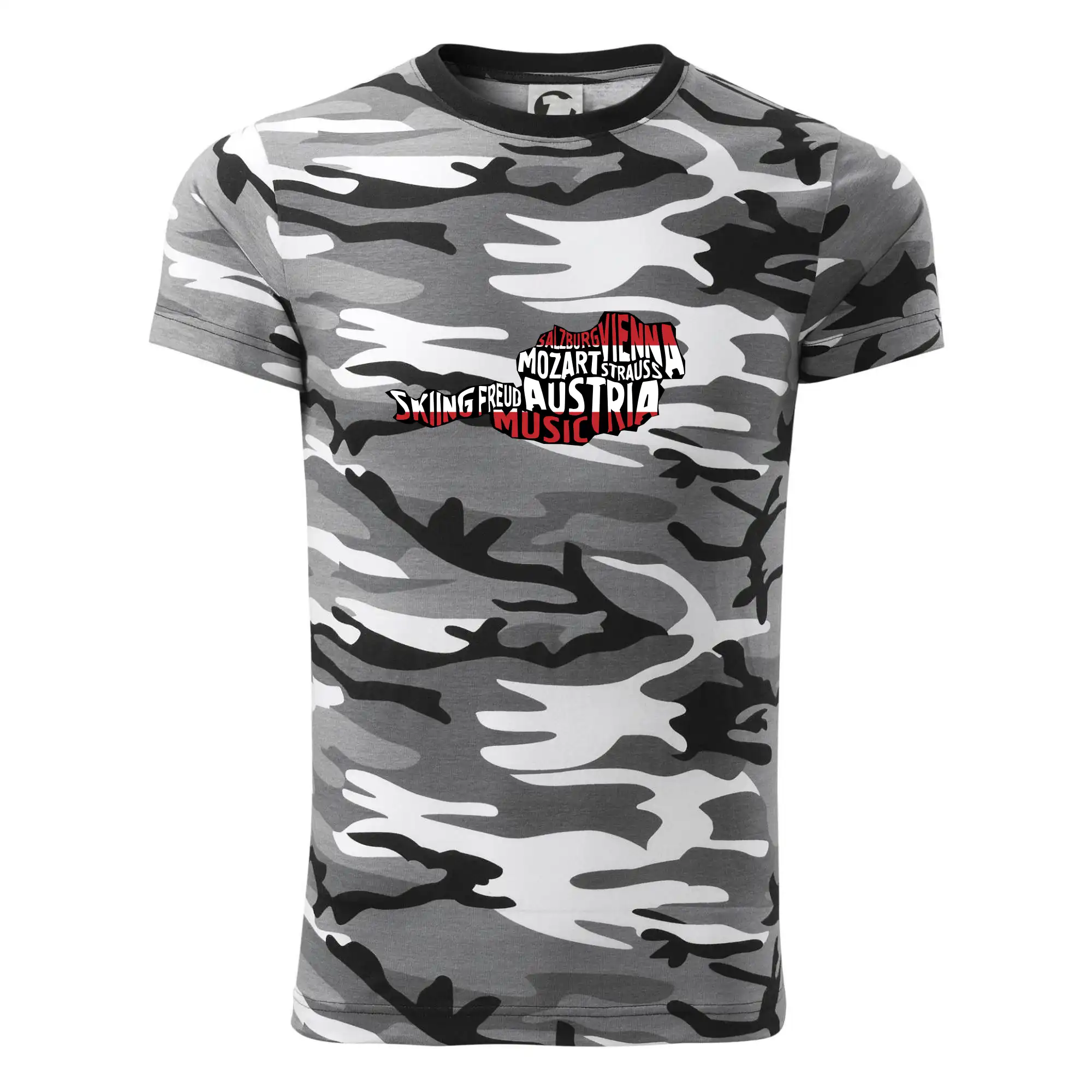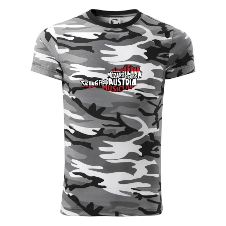 Tričko střední gramáže v barvách camouflage. Střih s bočními švy. Lem průkrčníku ze žebrového úpletu s přídavkem 5 % elastanu. Vnitřní část zadního průkrčníku začištěna páskou v barvě camouflage.