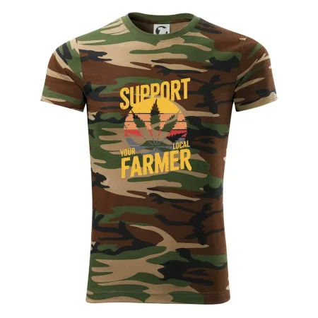 Tričko střední gramáže v barvách camouflage. Střih s bočními švy. Lem průkrčníku ze žebrového úpletu s přídavkem 5 % elastanu. Vnitřní část zadního průkrčníku začištěna páskou v barvě camouflage.
