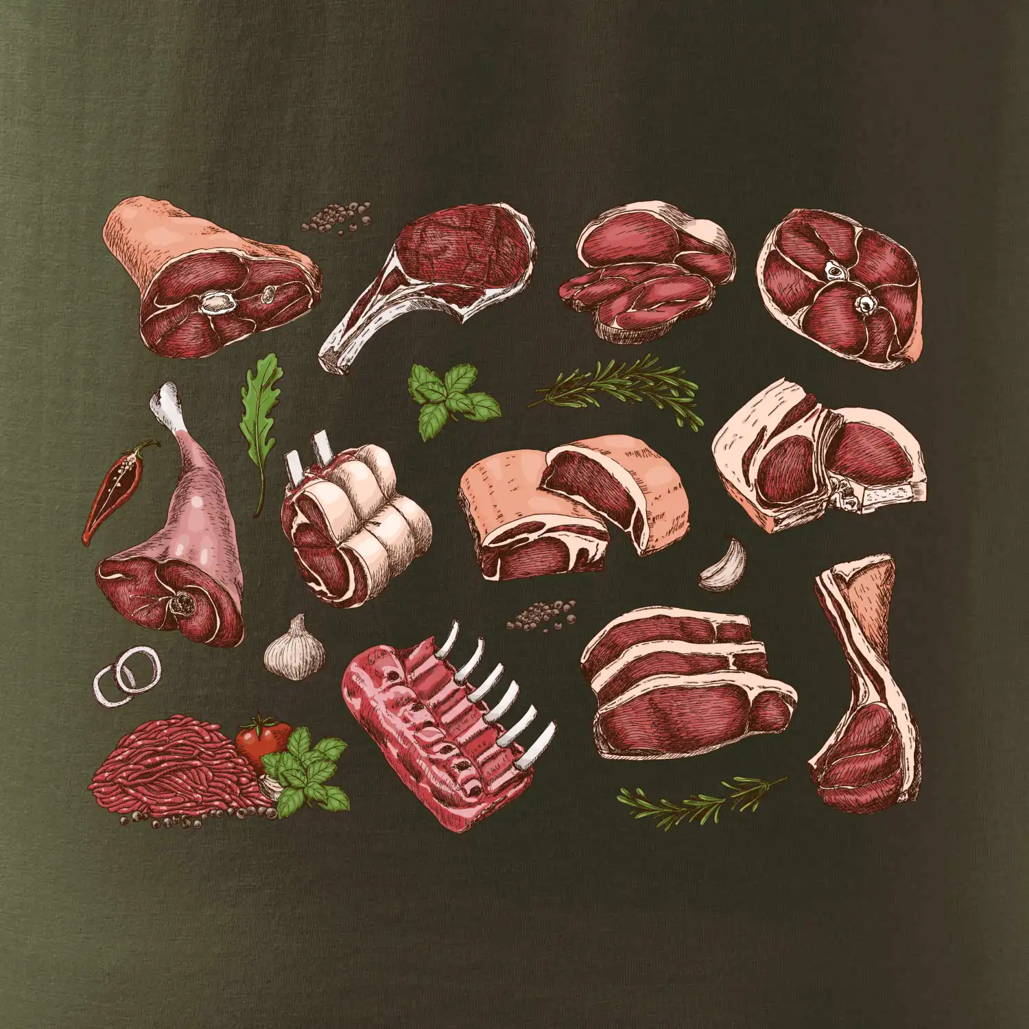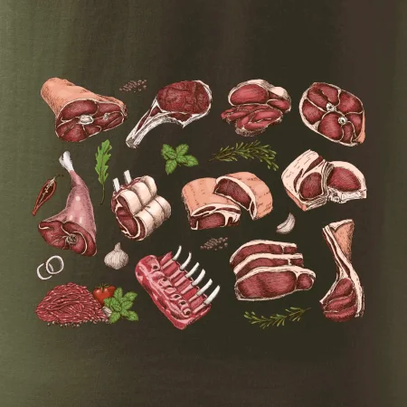 Triko, které je plné masa, by si měl pořídit každý kuchař. Na triku najdeš žebírka, kýtu i mleté maso. Triko pro kuchaře musí mít každý správný šéfkuchař i kuchtík. Vhodný dárek pro kuchaře, který má rád jídlo, hlavně maso.
