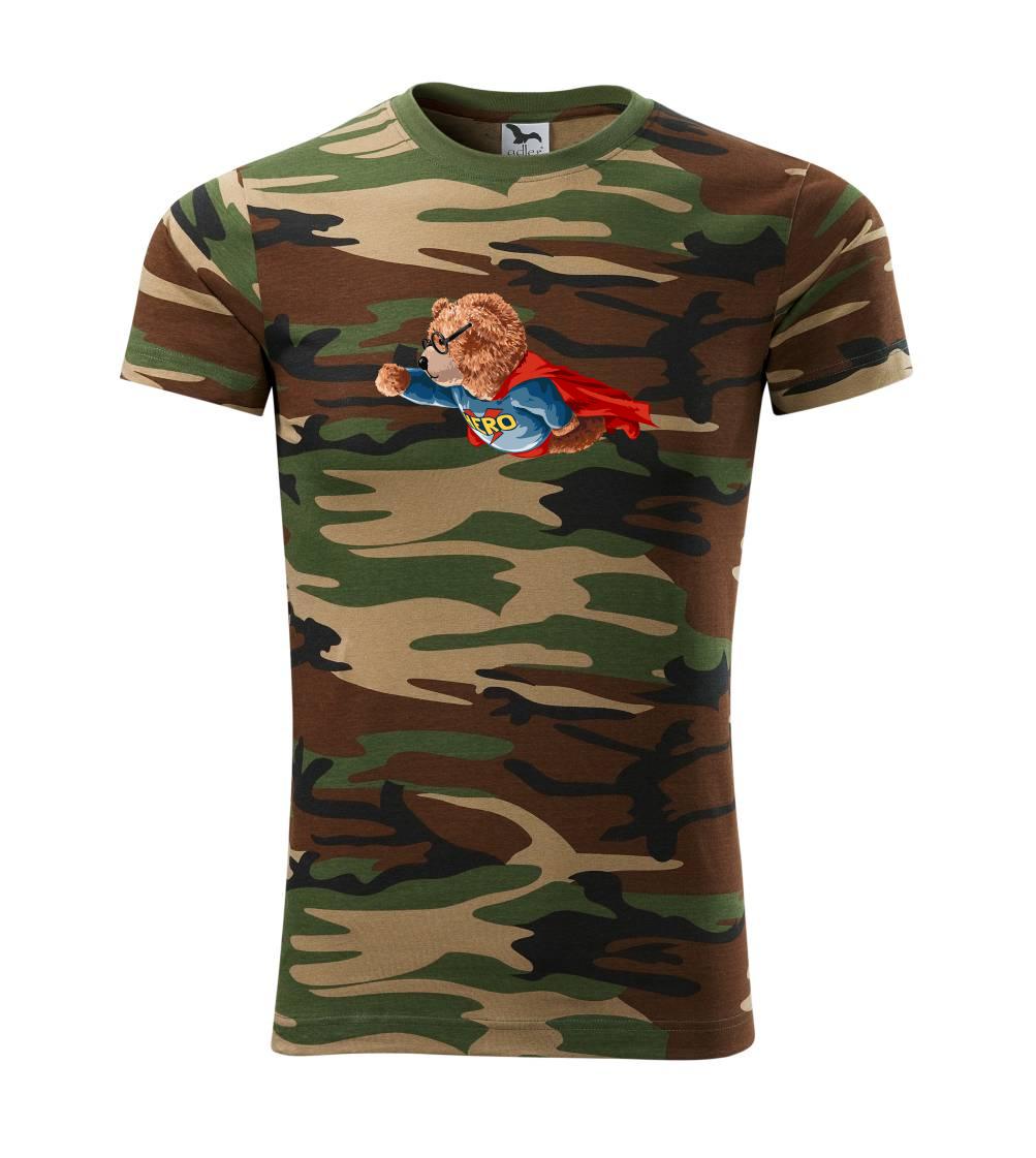 Tričko střední gramáže v barvách camouflage. Střih s bočními švy. Lem průkrčníku ze žebrového úpletu s přídavkem 5 % elastanu. Vnitřní část zadního průkrčníku začištěna páskou v barvě camouflage.