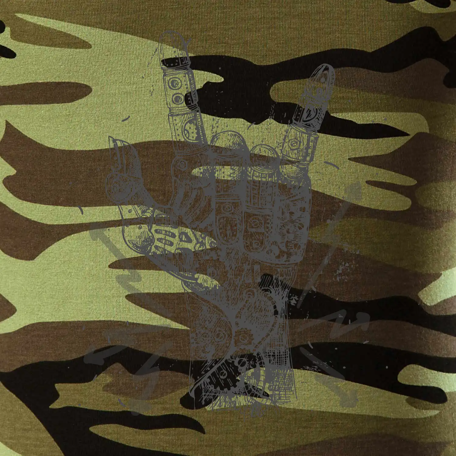 Tričko střední gramáže v barvách camouflage. Střih s bočními švy. Lem průkrčníku ze žebrového úpletu s přídavkem 5 % elastanu. Vnitřní část zadního průkrčníku začištěna páskou v barvě camouflage.
