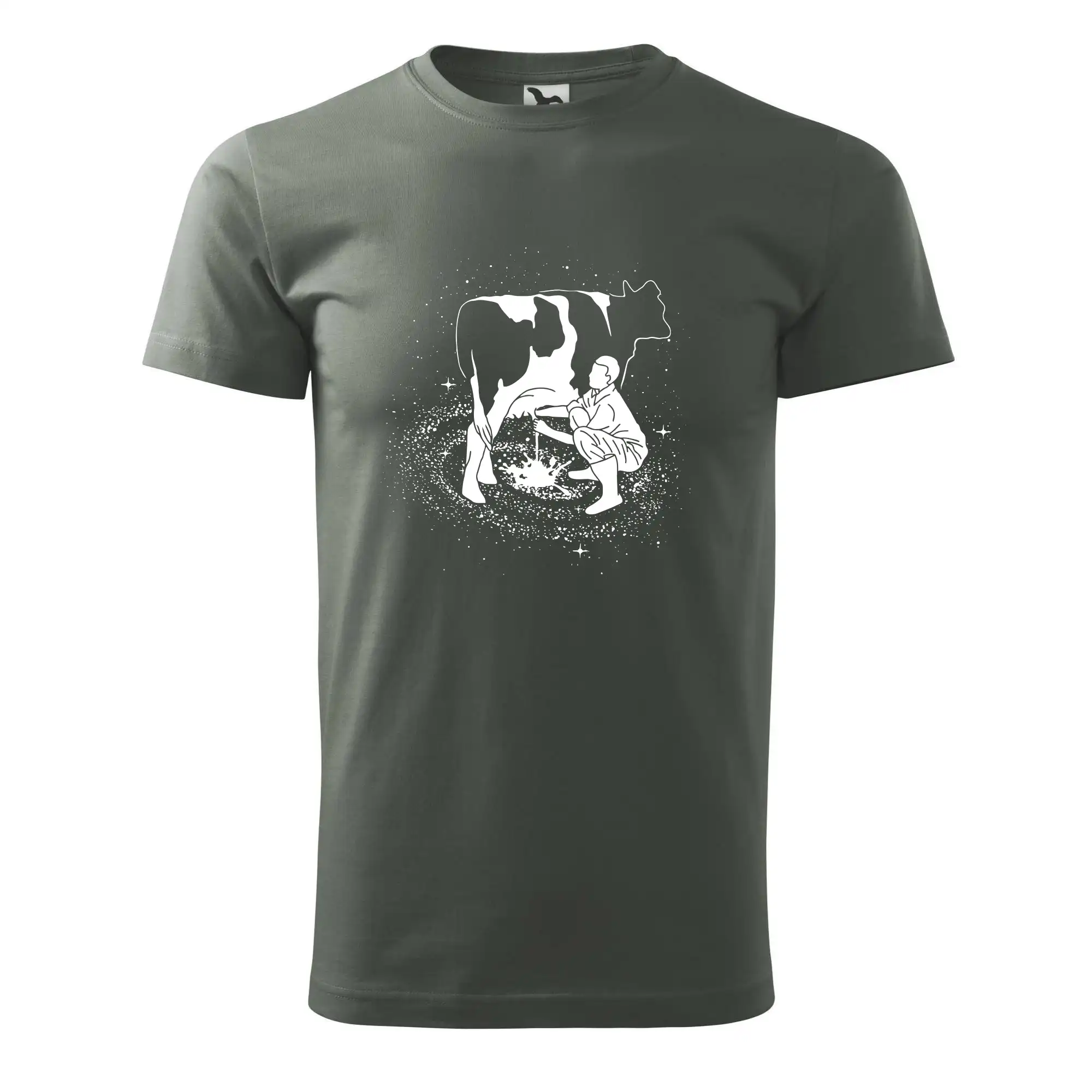Mléko nevzniká v obchodě v regále. Nejdřív se musí od šikovných zemědělců a farmářů na regál dostat. Pokud máš vztah k zemědělským zvířatům a víš třeba, jak podojit krávu, tak neváhej a kupuj triko s krávou.