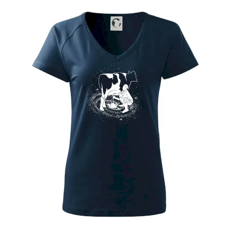 Mléko nevzniká v obchodě v regále. Nejdřív se musí od šikovných zemědělců a farmářů na regál dostat. Pokud máš vztah k zemědělským zvířatům a víš třeba, jak podojit krávu, tak neváhej a kupuj triko s krávou.