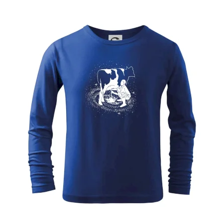 Mléko nevzniká v obchodě v regále. Nejdřív se musí od šikovných zemědělců a farmářů na regál dostat. Pokud máš vztah k zemědělským zvířatům a víš třeba, jak podojit krávu, tak neváhej a kupuj triko s krávou.