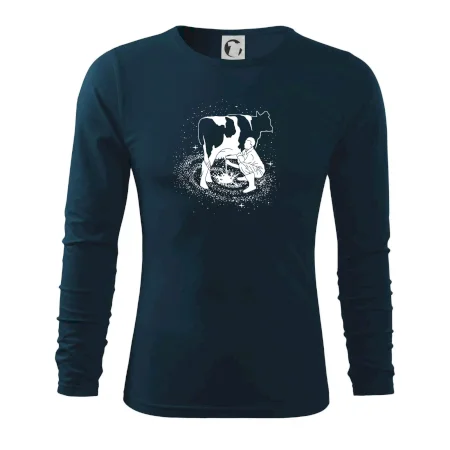 Mléko nevzniká v obchodě v regále. Nejdřív se musí od šikovných zemědělců a farmářů na regál dostat. Pokud máš vztah k zemědělským zvířatům a víš třeba, jak podojit krávu, tak neváhej a kupuj triko s krávou.