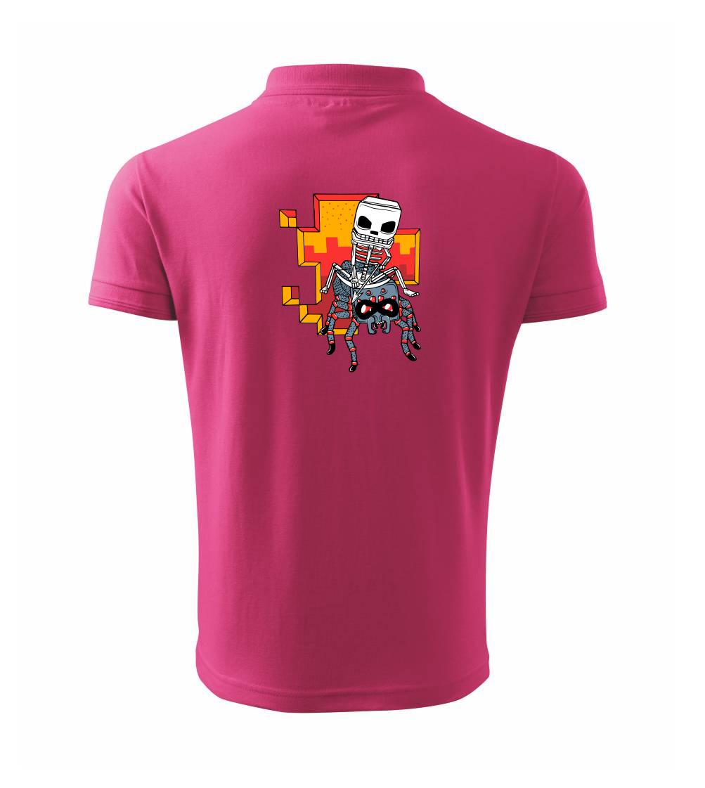 Triko na kterém je kostlivec na pavoukovi. Pavouk se nechtěl nechat zkrotit, ale kostlivec ho nakonec zdolal. Triko s kostlivcem jedoucím na pavoukovi.