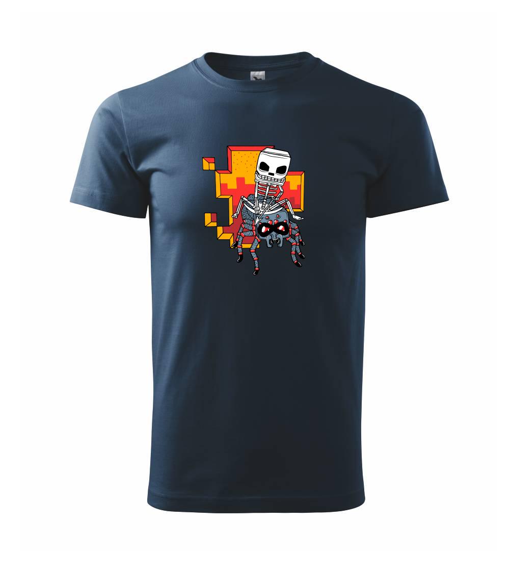 Triko na kterém je kostlivec na pavoukovi. Pavouk se nechtěl nechat zkrotit, ale kostlivec ho nakonec zdolal. Triko s kostlivcem jedoucím na pavoukovi.