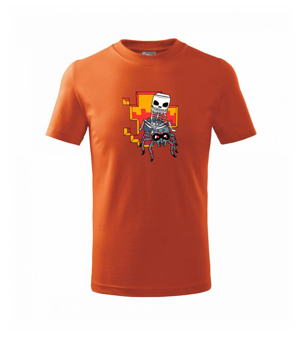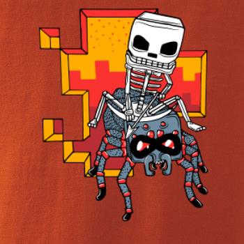 Triko na kterém je kostlivec na pavoukovi. Pavouk se nechtěl nechat zkrotit, ale kostlivec ho nakonec zdolal. Triko s kostlivcem jedoucím na pavoukovi.