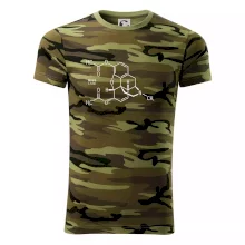 Tričko střední gramáže v barvách camouflage. Střih s bočními švy. Lem průkrčníku ze žebrového úpletu s přídavkem 5 % elastanu. Vnitřní část zadního průkrčníku začištěna páskou v barvě camouflage.