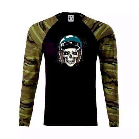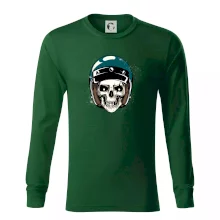 Triko pro motorkáře, na kterém je lebka s helmou, je skvělý dárek pro motorkáře. Modrá motorkářská helma ochrání lebku kostlivce i tu tvou. Každý motorkář bude mít triko s lebkou rád. Moto lebka, hlava kostlivce na tvém triku ukáže, že jsi motorkář až na kost.