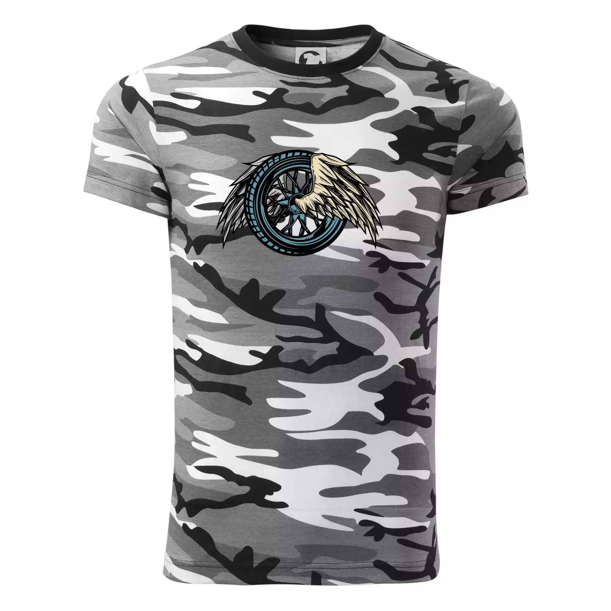 Tričko střední gramáže v barvách camouflage. Střih s bočními švy. Lem průkrčníku ze žebrového úpletu s přídavkem 5 % elastanu. Vnitřní část zadního průkrčníku začištěna páskou v barvě camouflage.