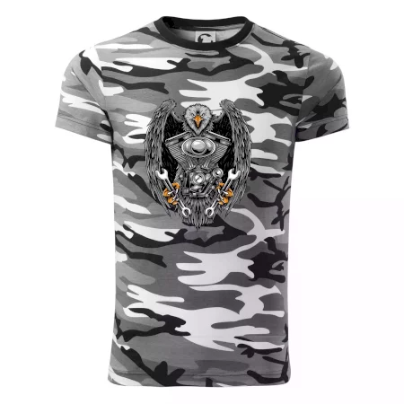 Tričko střední gramáže v barvách camouflage. Střih s bočními švy. Lem průkrčníku ze žebrového úpletu s přídavkem 5 % elastanu. Vnitřní část zadního průkrčníku začištěna páskou v barvě camouflage.