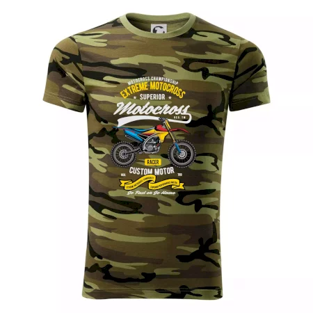 Tričko střední gramáže v barvách camouflage. Střih s bočními švy. Lem průkrčníku ze žebrového úpletu s přídavkem 5 % elastanu. Vnitřní část zadního průkrčníku začištěna páskou v barvě camouflage.