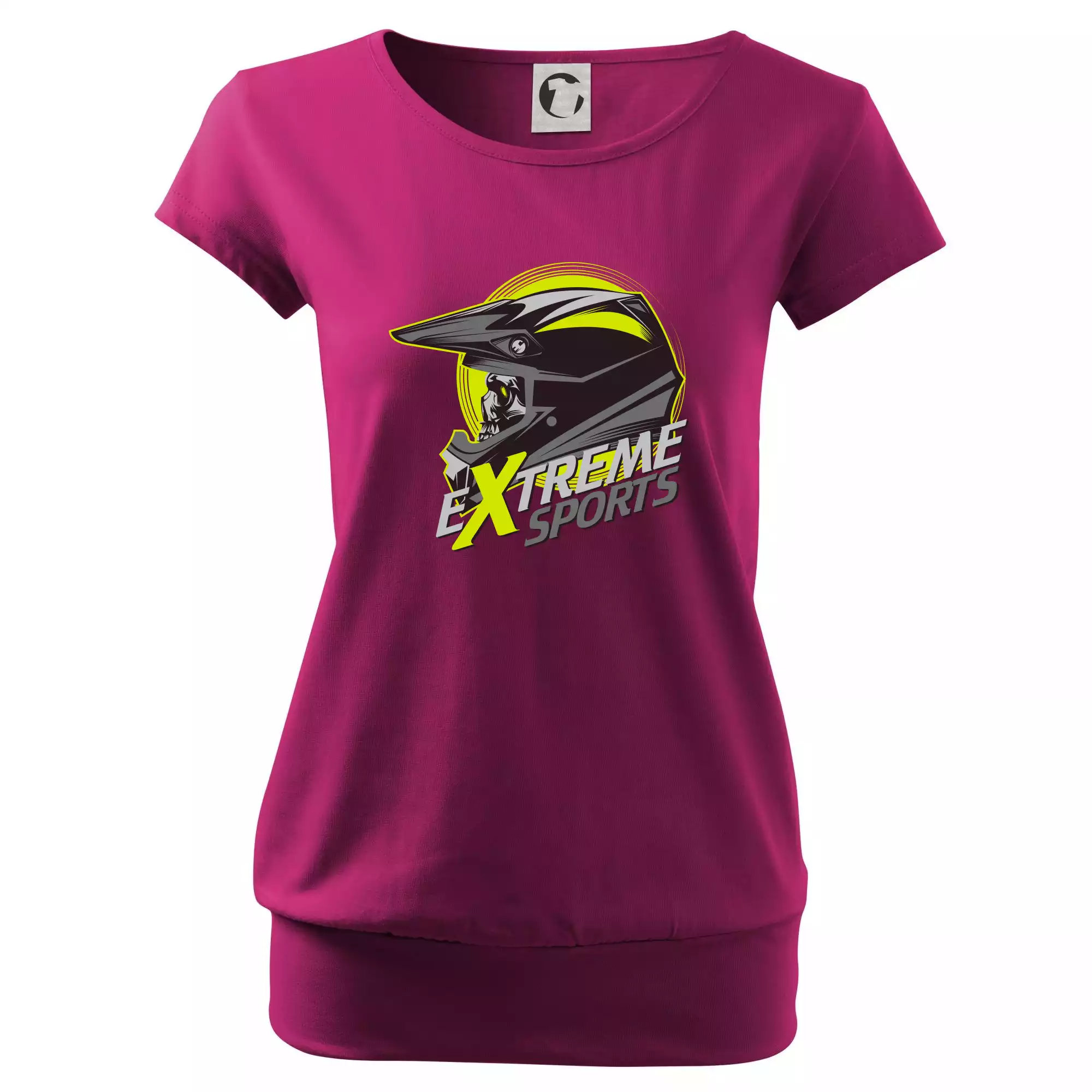 Trendové dámské triko s velmi krátkým rukávem, volnějšího střihu, v dolním kraji všité do širokého lemu. Kulatý průkrčník s úzkým lemem ze shodného materiálu.