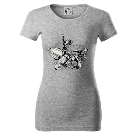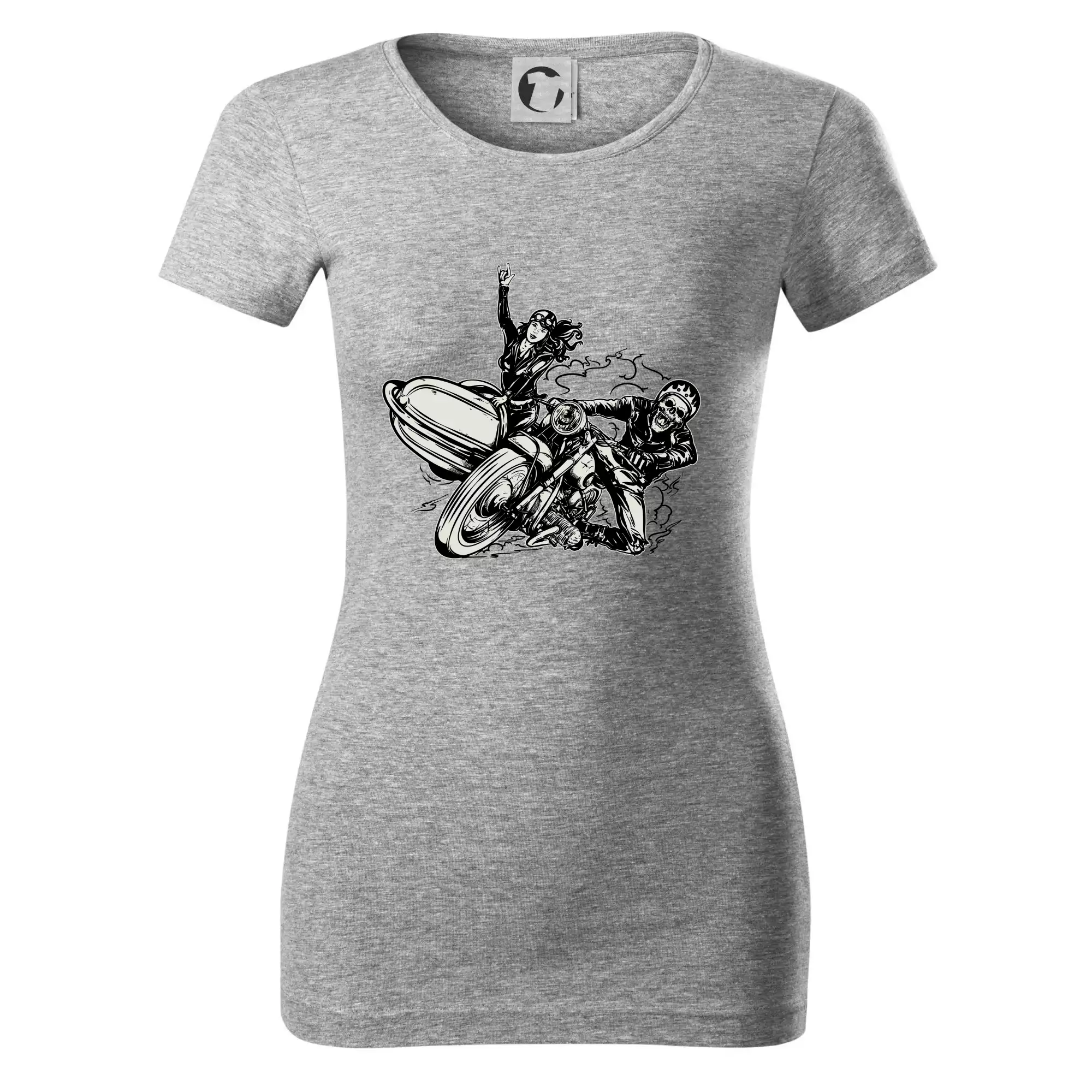 Triko pro motorkáře, na kterém je motorkář kostlivec na motorce. Sajdkára u motorky je skvělá možnost jak se může u tvého pekelného stroje objevit i krásná dívka stopařka. Motorka je životní styl, tak to ukaž tím, že si koupíš triko s motorkou. Pokud jsi pravý motorkář a máš rád rychlost, motorka se sajtkou je motiv ideální pro tebe. Moto triko je vhodný dárek pro každého motorkáře, který ví, co je to sajtkára.