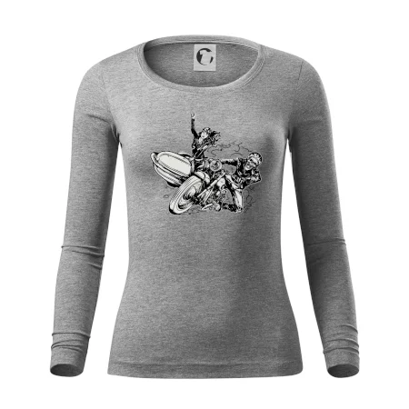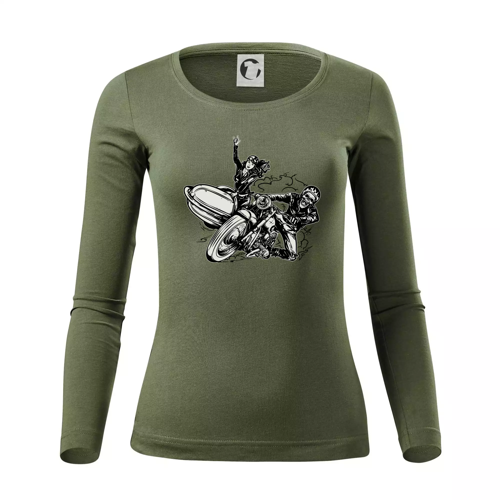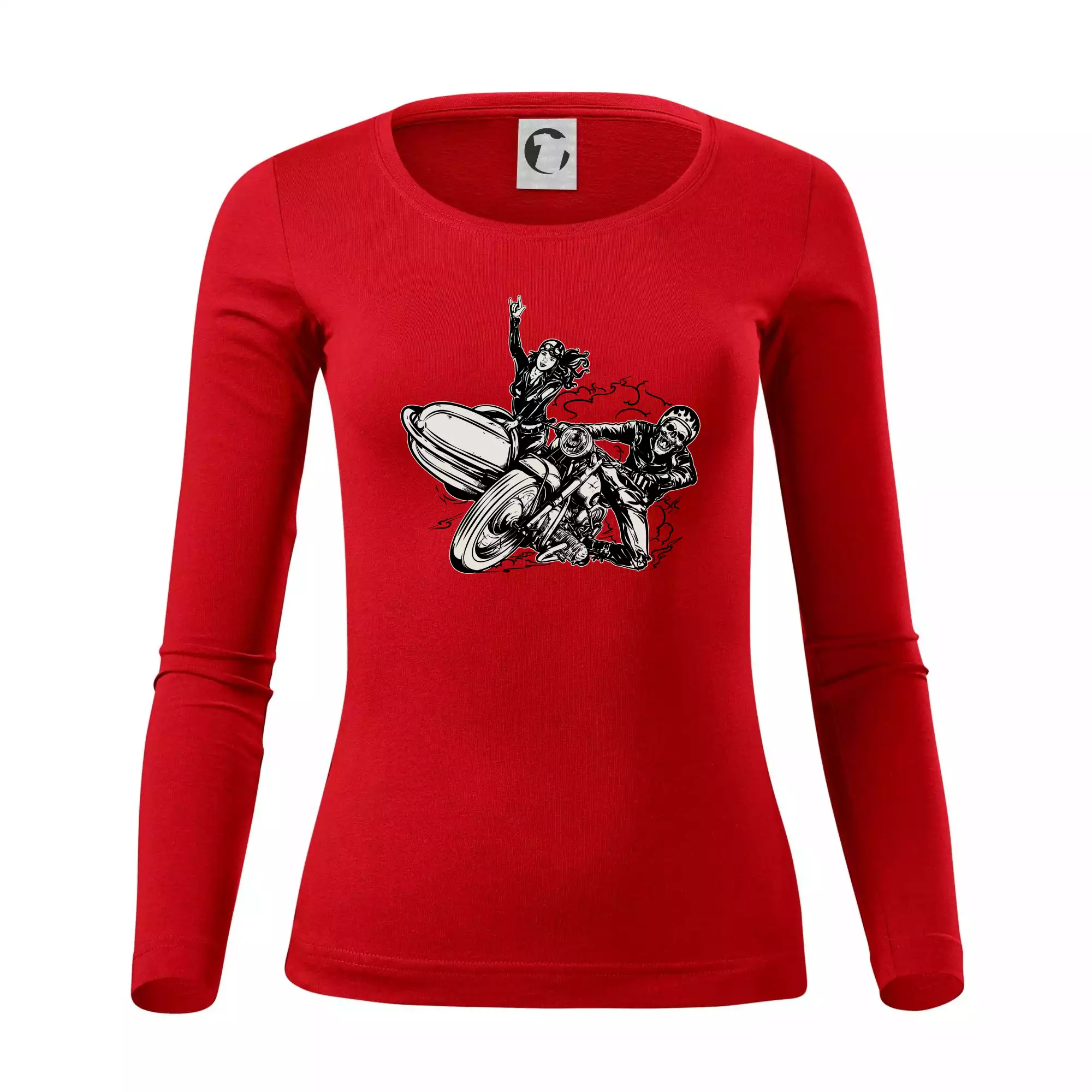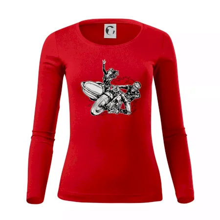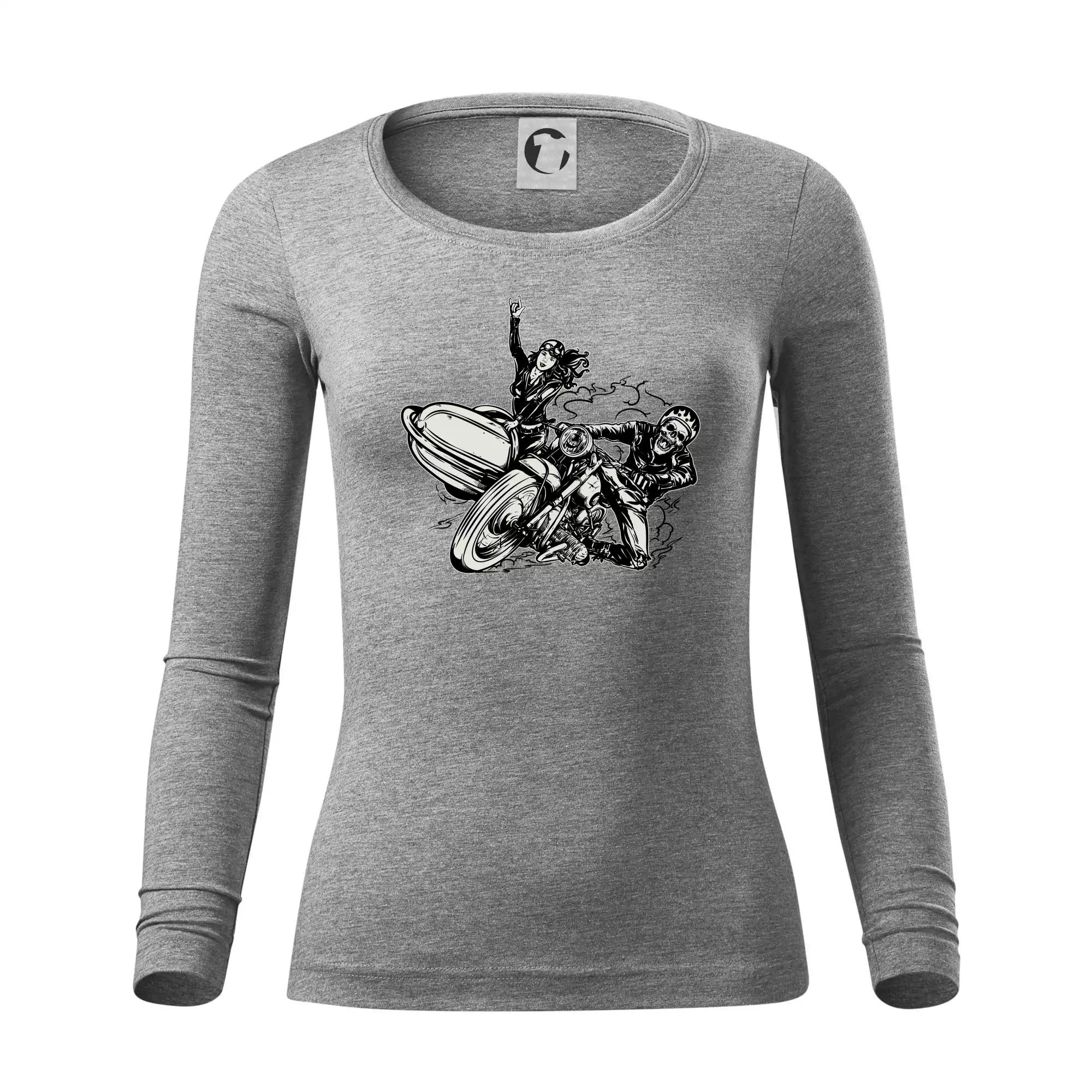 Triko pro motorkáře, na kterém je motorkář kostlivec na motorce. Sajdkára u motorky je skvělá možnost jak se může u tvého pekelného stroje objevit i krásná dívka stopařka. Motorka je životní styl, tak to ukaž tím, že si koupíš triko s motorkou. Pokud jsi pravý motorkář a máš rád rychlost, motorka se sajtkou je motiv ideální pro tebe. Moto triko je vhodný dárek pro každého motorkáře, který ví, co je to sajtkára.