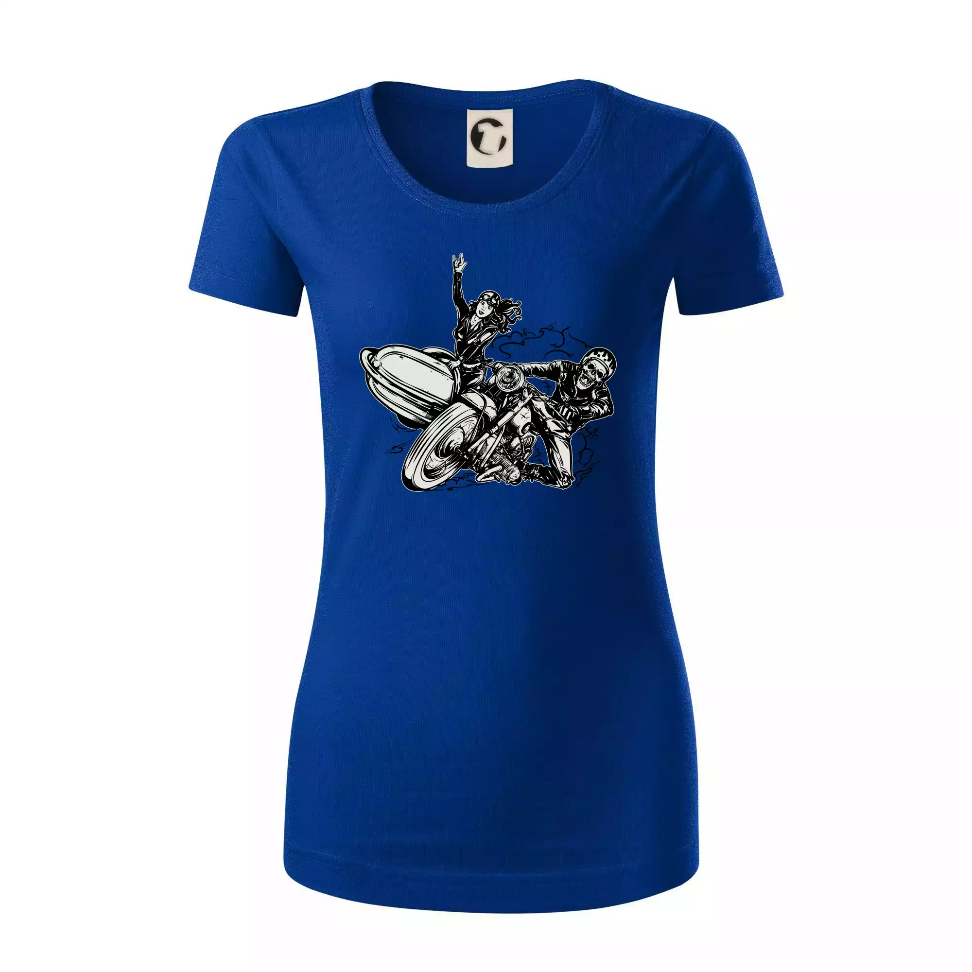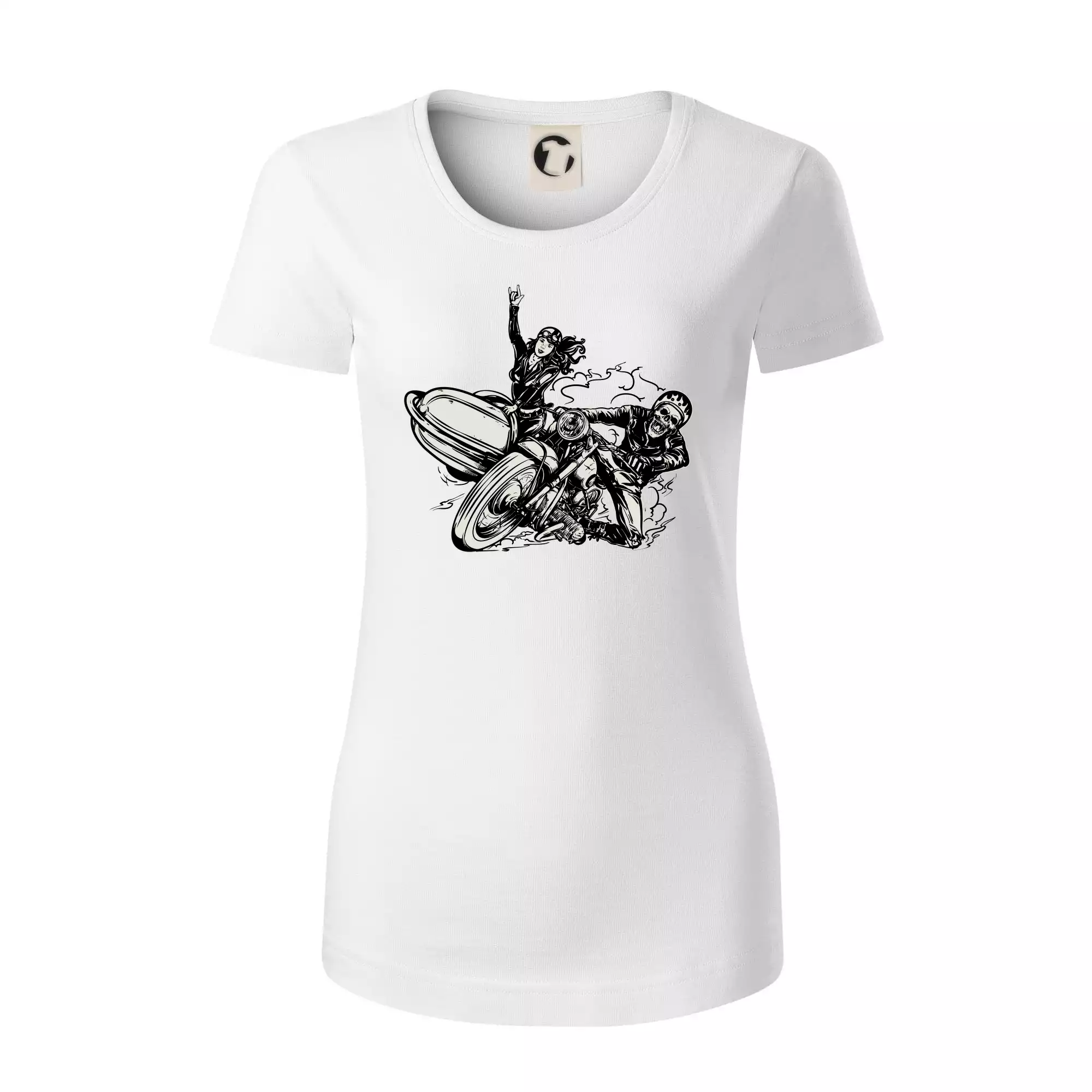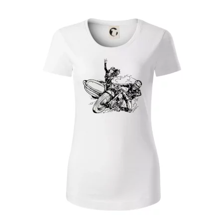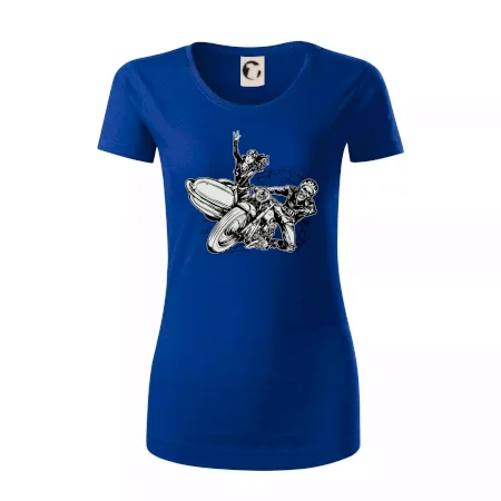 Triko pro motorkáře, na kterém je motorkář kostlivec na motorce. Sajdkára u motorky je skvělá možnost jak se může u tvého pekelného stroje objevit i krásná dívka stopařka. Motorka je životní styl, tak to ukaž tím, že si koupíš triko s motorkou. Pokud jsi pravý motorkář a máš rád rychlost, motorka se sajtkou je motiv ideální pro tebe. Moto triko je vhodný dárek pro každého motorkáře, který ví, co je to sajtkára.