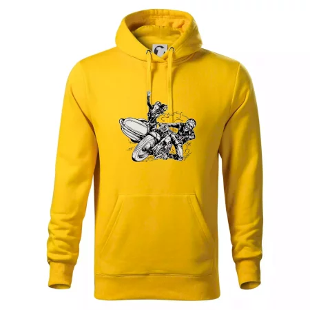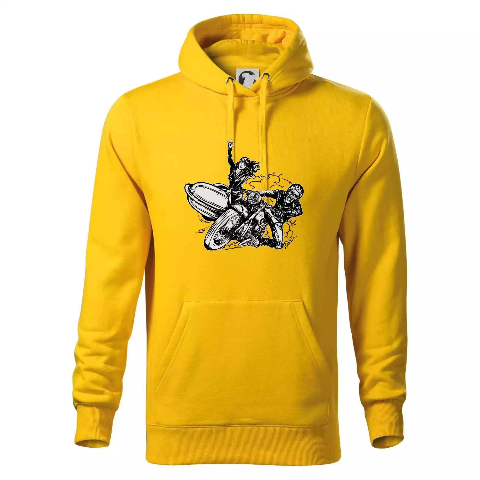 Triko pro motorkáře, na kterém je motorkář kostlivec na motorce. Sajdkára u motorky je skvělá možnost jak se může u tvého pekelného stroje objevit i krásná dívka stopařka. Motorka je životní styl, tak to ukaž tím, že si koupíš triko s motorkou. Pokud jsi pravý motorkář a máš rád rychlost, motorka se sajtkou je motiv ideální pro tebe. Moto triko je vhodný dárek pro každého motorkáře, který ví, co je to sajtkára.