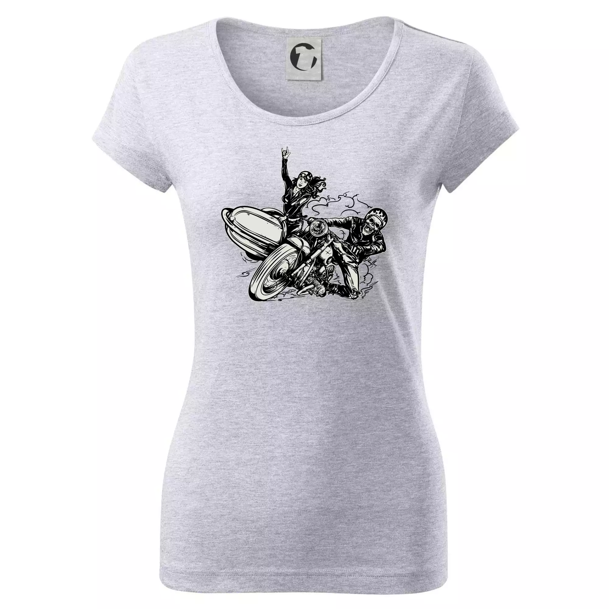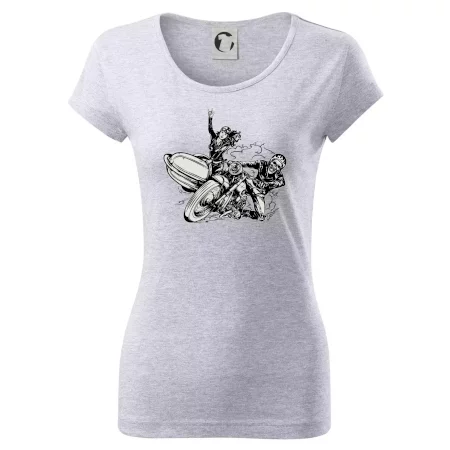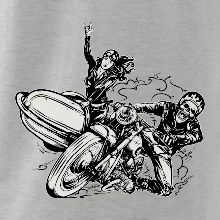 Triko pro motorkáře, na kterém je motorkář kostlivec na motorce. Sajdkára u motorky je skvělá možnost jak se může u tvého pekelného stroje objevit i krásná dívka stopařka. Motorka je životní styl, tak to ukaž tím, že si koupíš triko s motorkou. Pokud jsi pravý motorkář a máš rád rychlost, motorka se sajtkou je motiv ideální pro tebe. Moto triko je vhodný dárek pro každého motorkáře, který ví, co je to sajtkára.