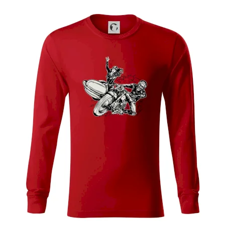 Triko pro motorkáře, na kterém je motorkář kostlivec na motorce. Sajdkára u motorky je skvělá možnost jak se může u tvého pekelného stroje objevit i krásná dívka stopařka. Motorka je životní styl, tak to ukaž tím, že si koupíš triko s motorkou. Pokud jsi pravý motorkář a máš rád rychlost, motorka se sajtkou je motiv ideální pro tebe. Moto triko je vhodný dárek pro každého motorkáře, který ví, co je to sajtkára.