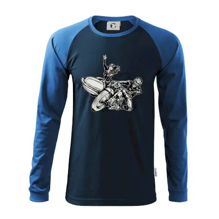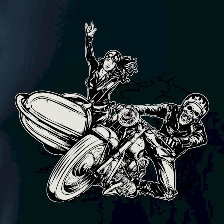 Triko pro motorkáře, na kterém je motorkář kostlivec na motorce. Sajdkára u motorky je skvělá možnost jak se může u tvého pekelného stroje objevit i krásná dívka stopařka. Motorka je životní styl, tak to ukaž tím, že si koupíš triko s motorkou. Pokud jsi pravý motorkář a máš rád rychlost, motorka se sajtkou je motiv ideální pro tebe. Moto triko je vhodný dárek pro každého motorkáře, který ví, co je to sajtkára.