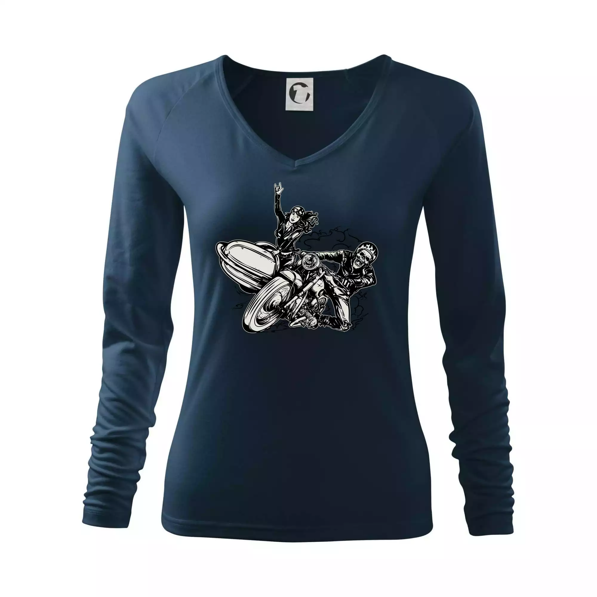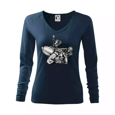 Triko pro motorkáře, na kterém je motorkář kostlivec na motorce. Sajdkára u motorky je skvělá možnost jak se může u tvého pekelného stroje objevit i krásná dívka stopařka. Motorka je životní styl, tak to ukaž tím, že si koupíš triko s motorkou. Pokud jsi pravý motorkář a máš rád rychlost, motorka se sajtkou je motiv ideální pro tebe. Moto triko je vhodný dárek pro každého motorkáře, který ví, co je to sajtkára.