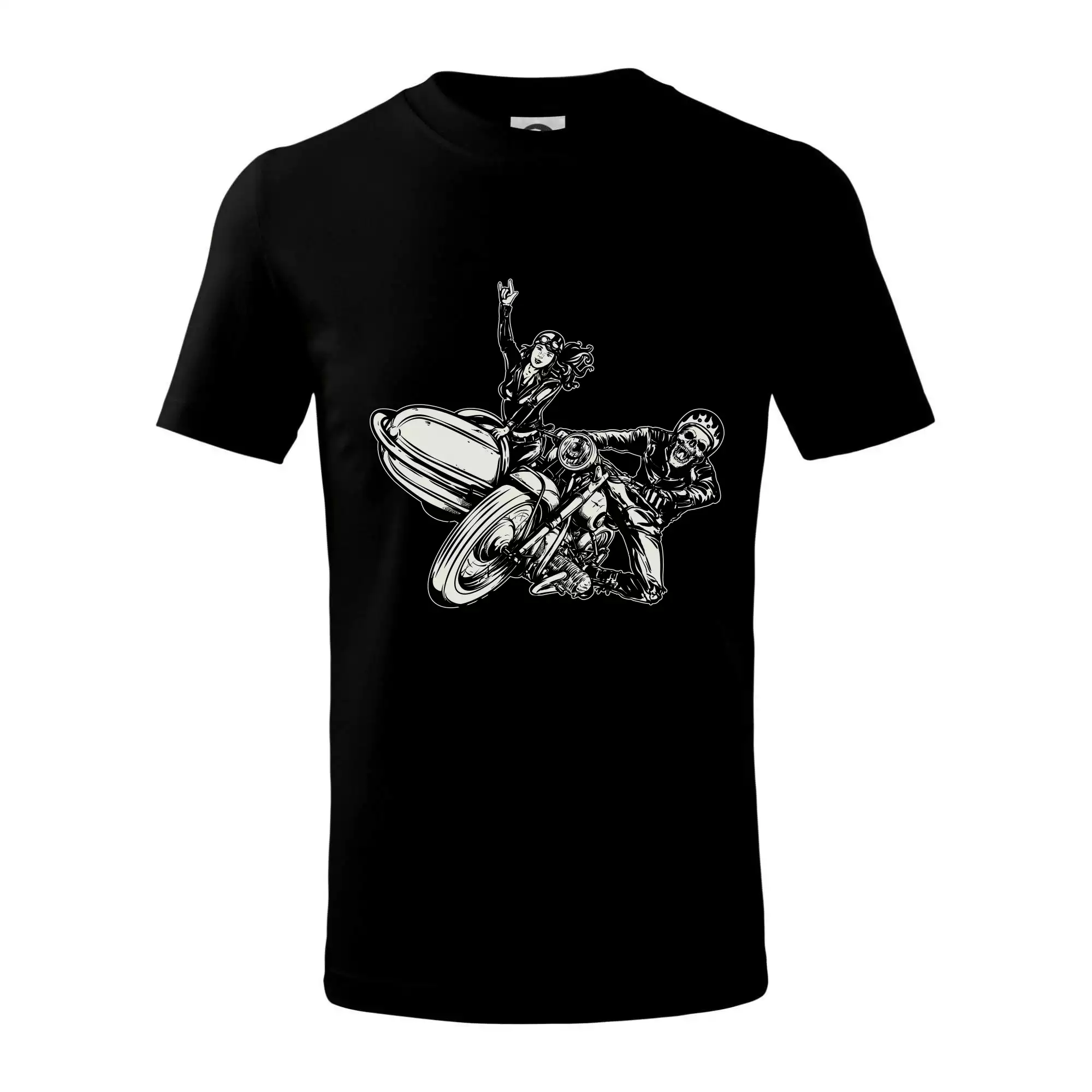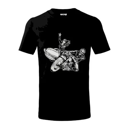 Triko pro motorkáře, na kterém je motorkář kostlivec na motorce. Sajdkára u motorky je skvělá možnost jak se může u tvého pekelného stroje objevit i krásná dívka stopařka. Motorka je životní styl, tak to ukaž tím, že si koupíš triko s motorkou. Pokud jsi pravý motorkář a máš rád rychlost, motorka se sajtkou je motiv ideální pro tebe. Moto triko je vhodný dárek pro každého motorkáře, který ví, co je to sajtkára.