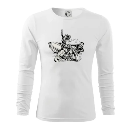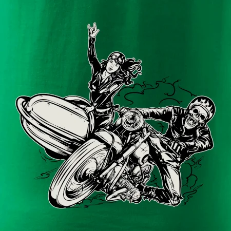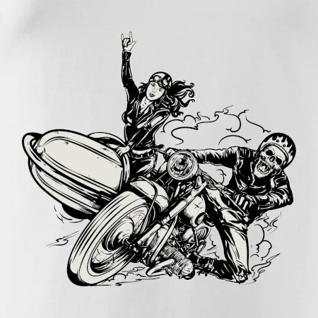 Triko pro motorkáře, na kterém je motorkář kostlivec na motorce. Sajdkára u motorky je skvělá možnost jak se může u tvého pekelného stroje objevit i krásná dívka stopařka. Motorka je životní styl, tak to ukaž tím, že si koupíš triko s motorkou. Pokud jsi pravý motorkář a máš rád rychlost, motorka se sajtkou je motiv ideální pro tebe. Moto triko je vhodný dárek pro každého motorkáře, který ví, co je to sajtkára.