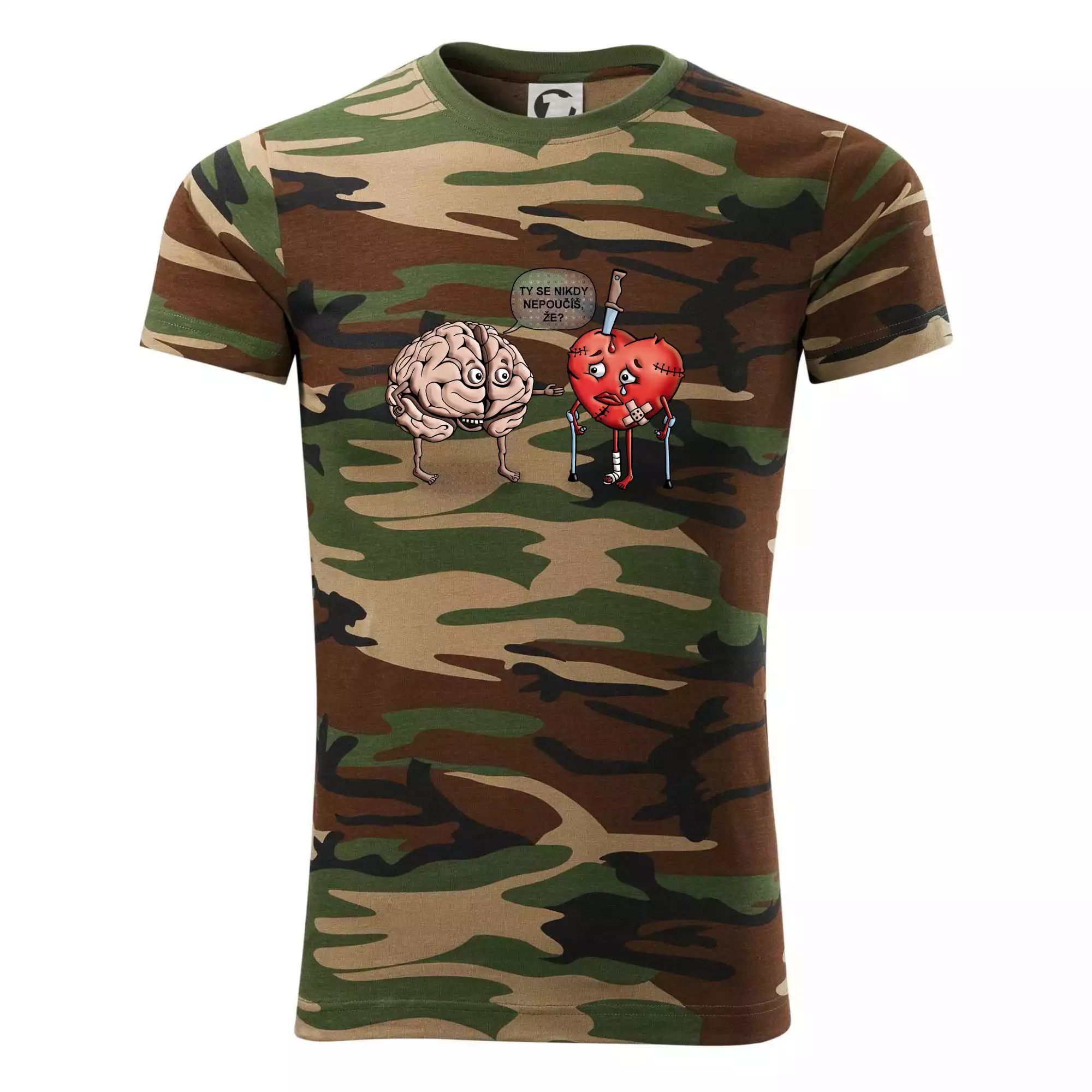 Tričko střední gramáže v barvách camouflage. Střih s bočními švy. Lem průkrčníku ze žebrového úpletu s přídavkem 5 % elastanu. Vnitřní část zadního průkrčníku začištěna páskou v barvě camouflage.