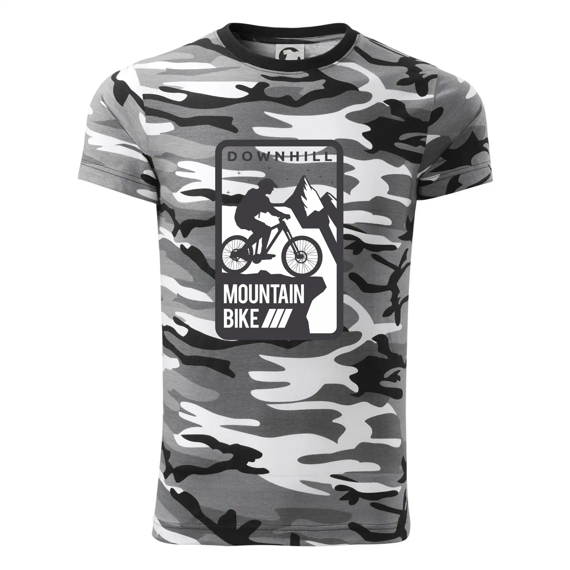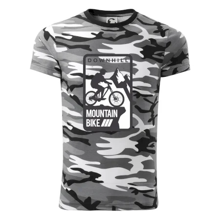 Tričko střední gramáže v barvách camouflage. Střih s bočními švy. Lem průkrčníku ze žebrového úpletu s přídavkem 5 % elastanu. Vnitřní část zadního průkrčníku začištěna páskou v barvě camouflage.
