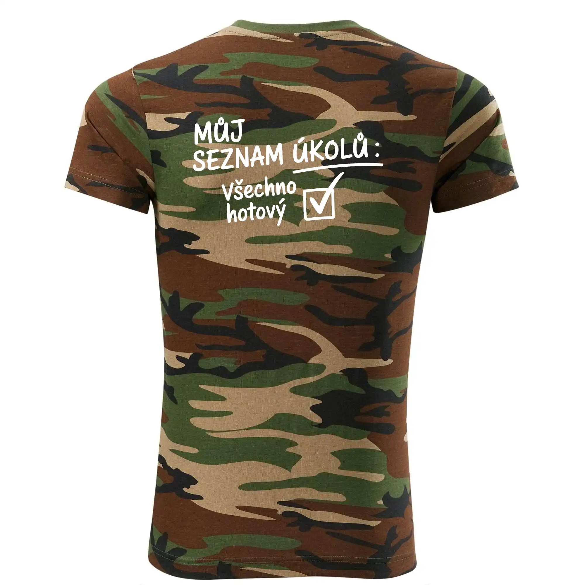 Tričko střední gramáže v barvách camouflage. Střih s bočními švy. Lem průkrčníku ze žebrového úpletu s přídavkem 5 % elastanu. Vnitřní část zadního průkrčníku začištěna páskou v barvě camouflage.
