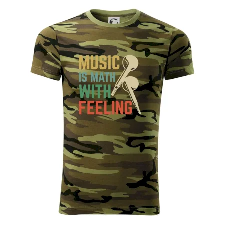 Tričko střední gramáže v barvách camouflage. Střih s bočními švy. Lem průkrčníku ze žebrového úpletu s přídavkem 5 % elastanu. Vnitřní část zadního průkrčníku začištěna páskou v barvě camouflage.