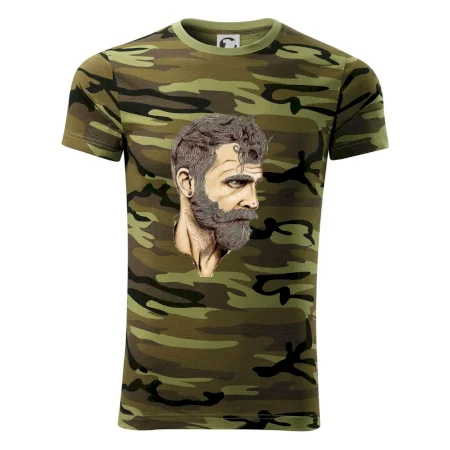 Tričko střední gramáže v barvách camouflage. Střih s bočními švy. Lem průkrčníku ze žebrového úpletu s přídavkem 5 % elastanu. Vnitřní část zadního průkrčníku začištěna páskou v barvě camouflage.