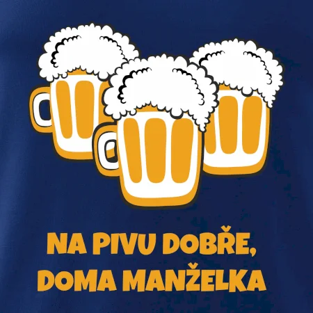 Máš rád pivo? Triko pro pivaře, na kterém je nápis "Na pivu dobře, doma manželka". Pivní triko, na kterém je pivní půllitr ocení každý pivař. Triko je vhodný dárek pro pivaře.