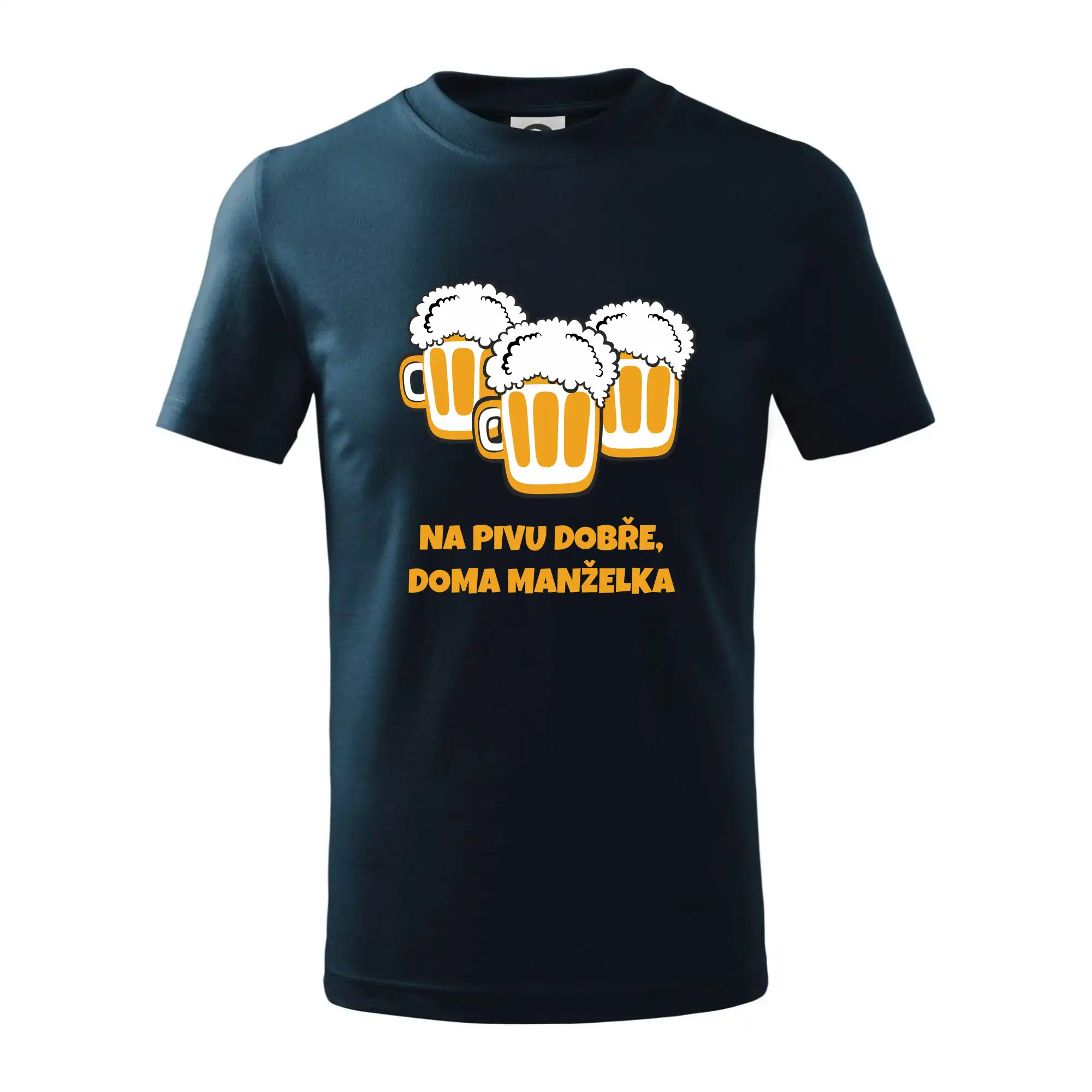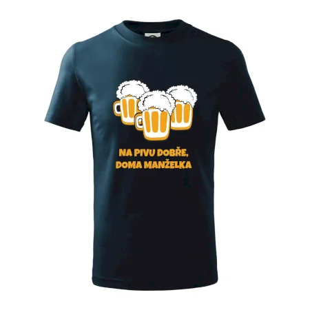 Máš rád pivo? Triko pro pivaře, na kterém je nápis "Na pivu dobře, doma manželka". Pivní triko, na kterém je pivní půllitr ocení každý pivař. Triko je vhodný dárek pro pivaře.