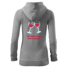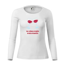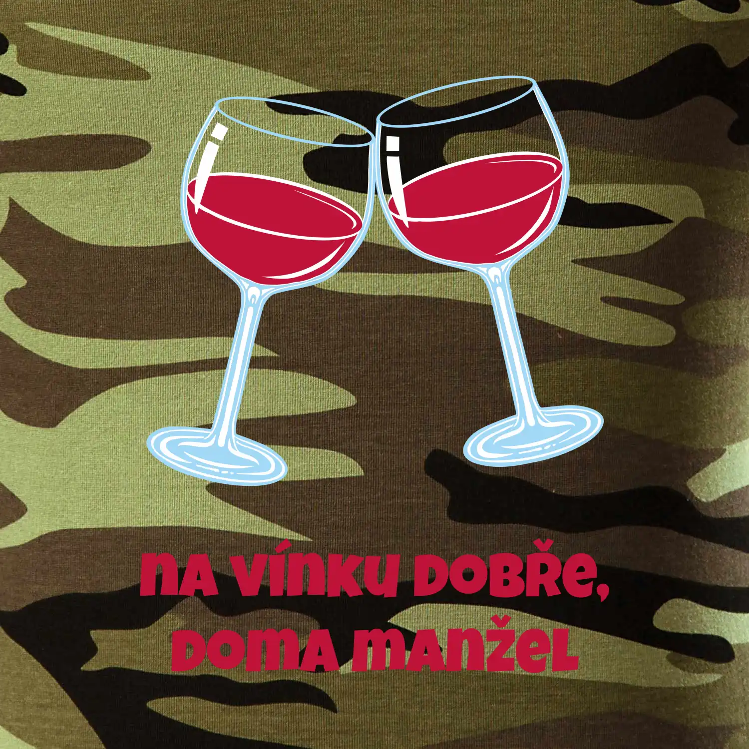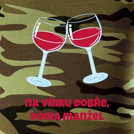 Triko pro vinaře s nápisem "Na vínku dobře, doma manžel." Vinařské triko, na kterém jsou dvě skleničky s červeným vínem. Triko je vhodný dárek pro vinaře, ideálně pokud má rád červené víno.