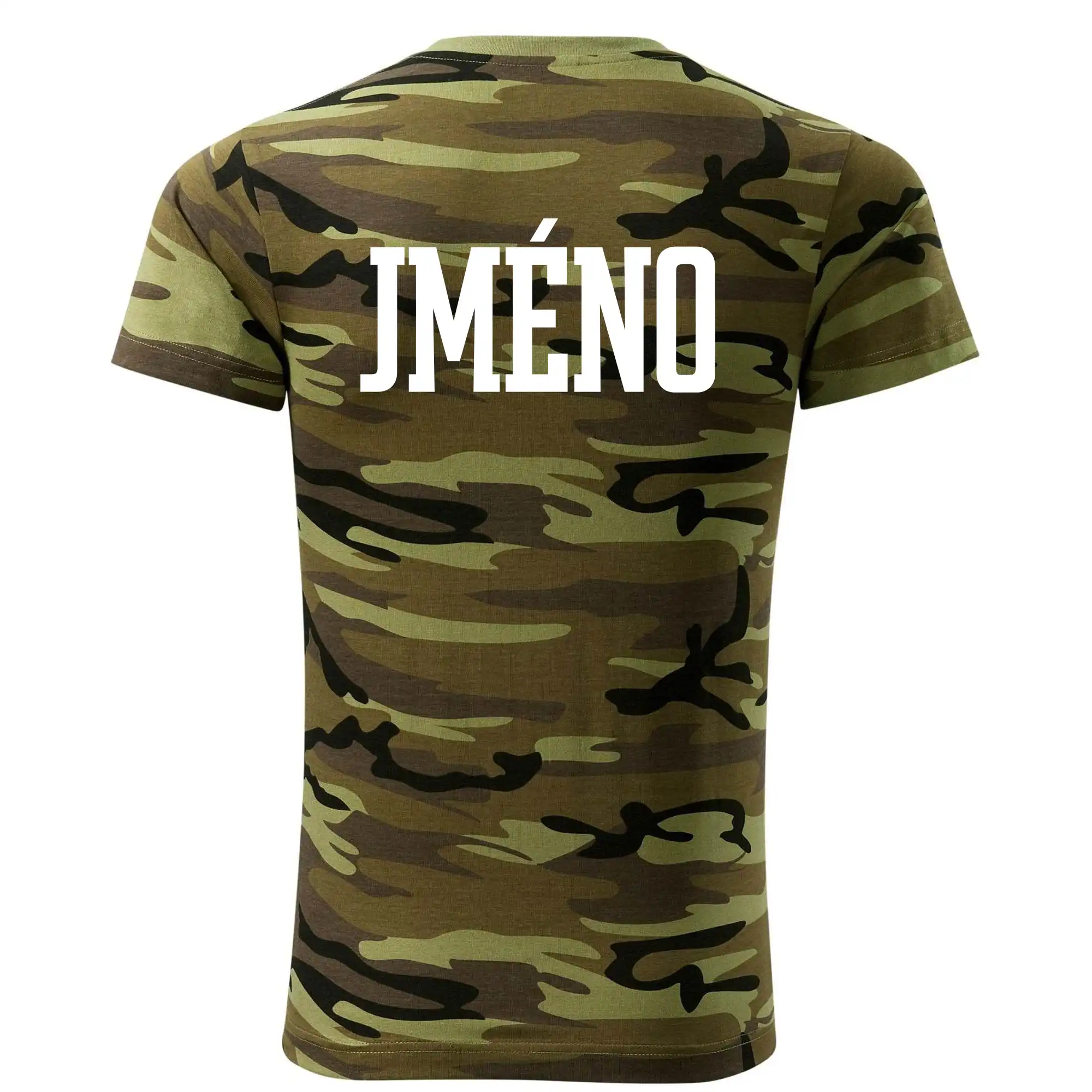 Tričko střední gramáže v barvách camouflage. Střih s bočními švy. Lem průkrčníku ze žebrového úpletu s přídavkem 5 % elastanu. Vnitřní část zadního průkrčníku začištěna páskou v barvě camouflage.