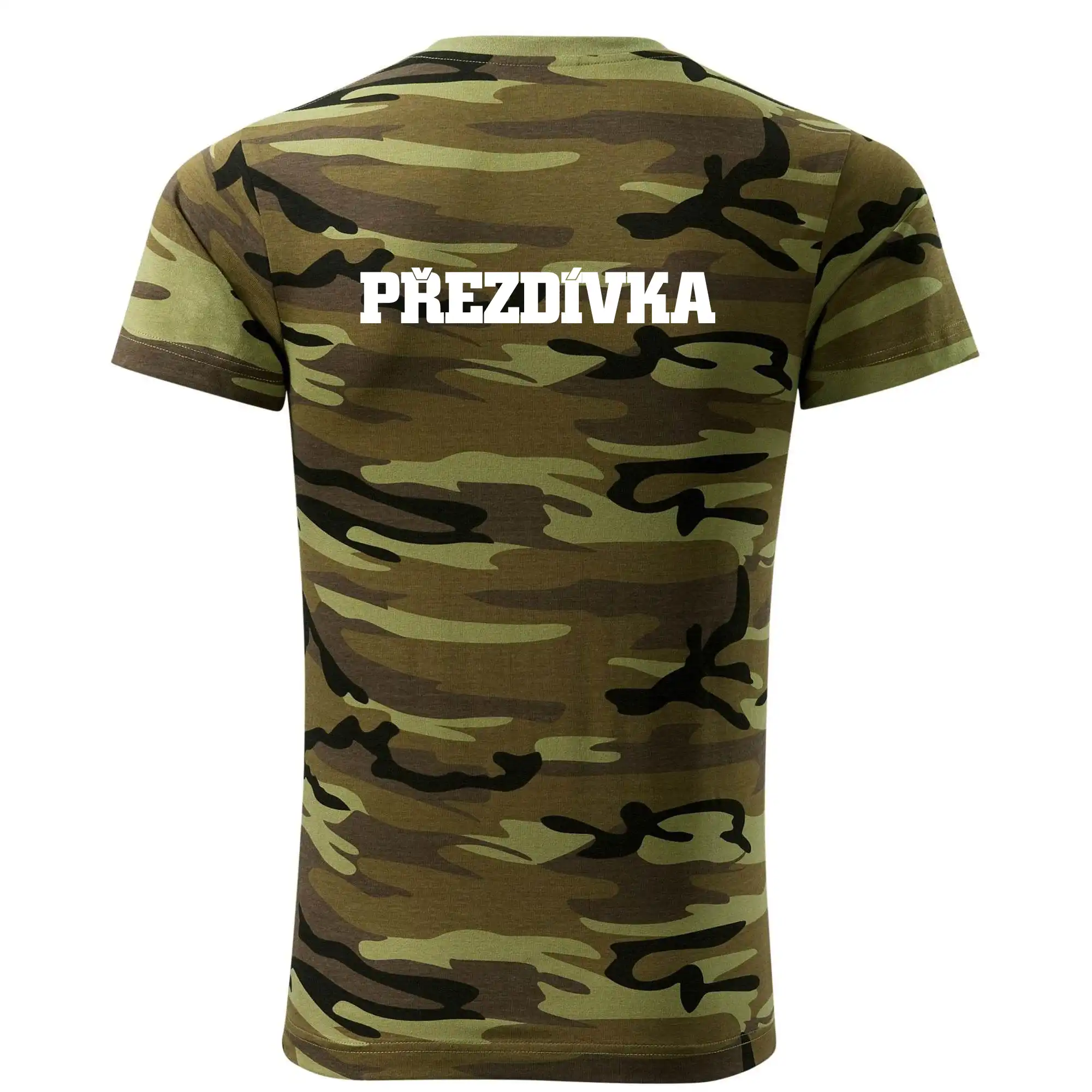 Tričko střední gramáže v barvách camouflage. Střih s bočními švy. Lem průkrčníku ze žebrového úpletu s přídavkem 5 % elastanu. Vnitřní část zadního průkrčníku začištěna páskou v barvě camouflage.