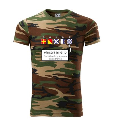 Tričko střední gramáže v barvách camouflage. Střih s bočními švy. Lem průkrčníku ze žebrového úpletu s přídavkem 5 % elastanu. Vnitřní část zadního průkrčníku začištěna páskou v barvě camouflage.