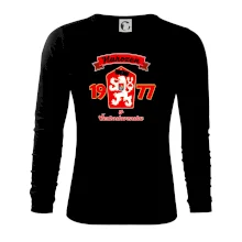 V březnu 69 naši hokejisté porazili dvakrát během týdne Sovětský svaz. Lidé v Československu to vzali jako pomstu za okupaci v srpnu 68. Na zápas někteří hokejisté nastoupili s přeškrtnutou hvězdou na dresu a přesně tento znak na triku si můžete zakoupit.