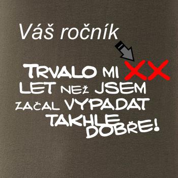 Vtipné narozeninové tričko s nápisem "Trvalo mi XX let než jsem začal vypadat takhle dobře!" Tričko potěší oslavence v každém věku. Svůj věk nezapomeň připsat do poznámky!