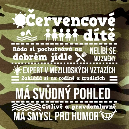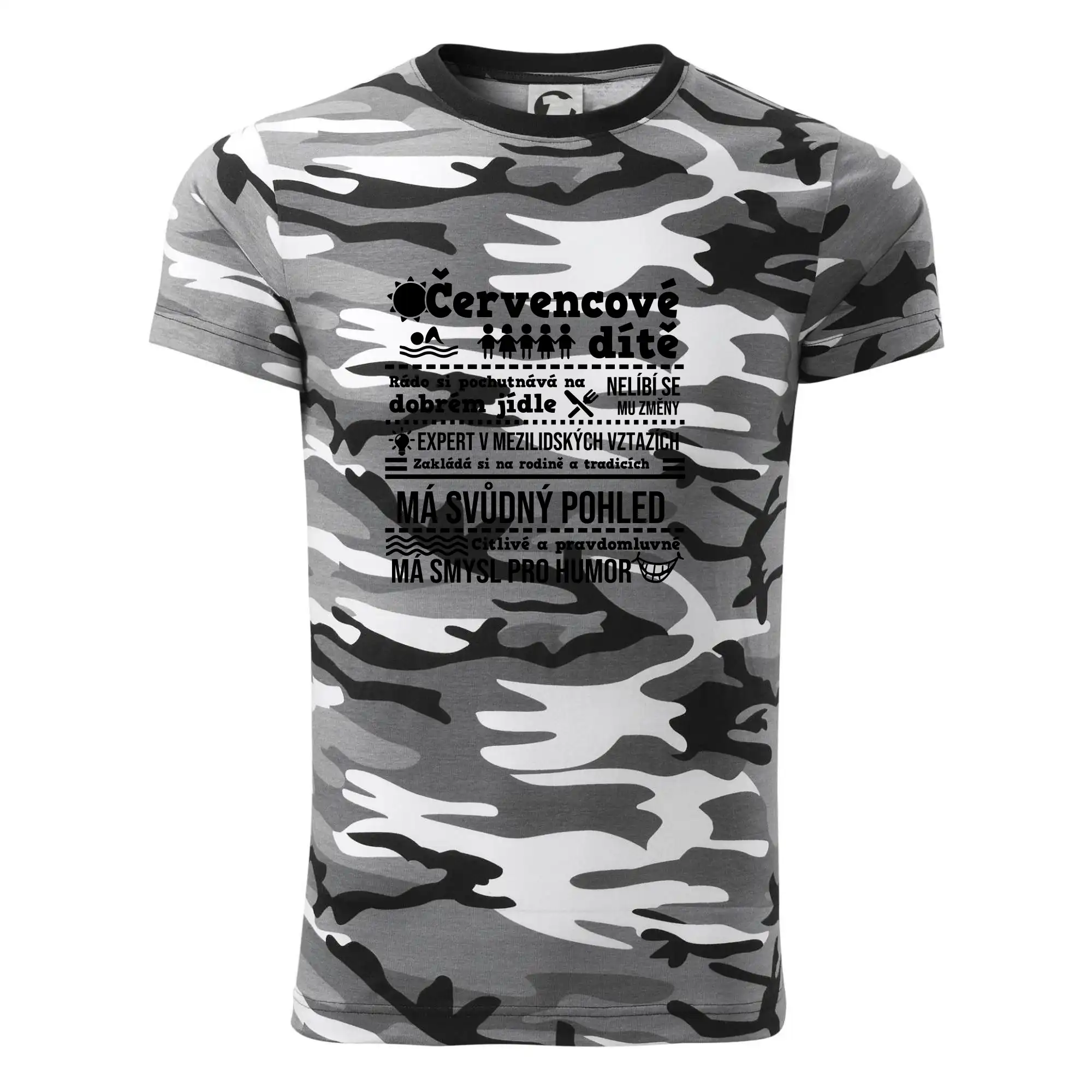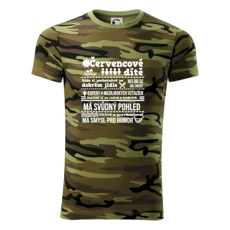 Tričko střední gramáže v barvách camouflage. Střih s bočními švy. Lem průkrčníku ze žebrového úpletu s přídavkem 5 % elastanu. Vnitřní část zadního průkrčníku začištěna páskou v barvě camouflage.