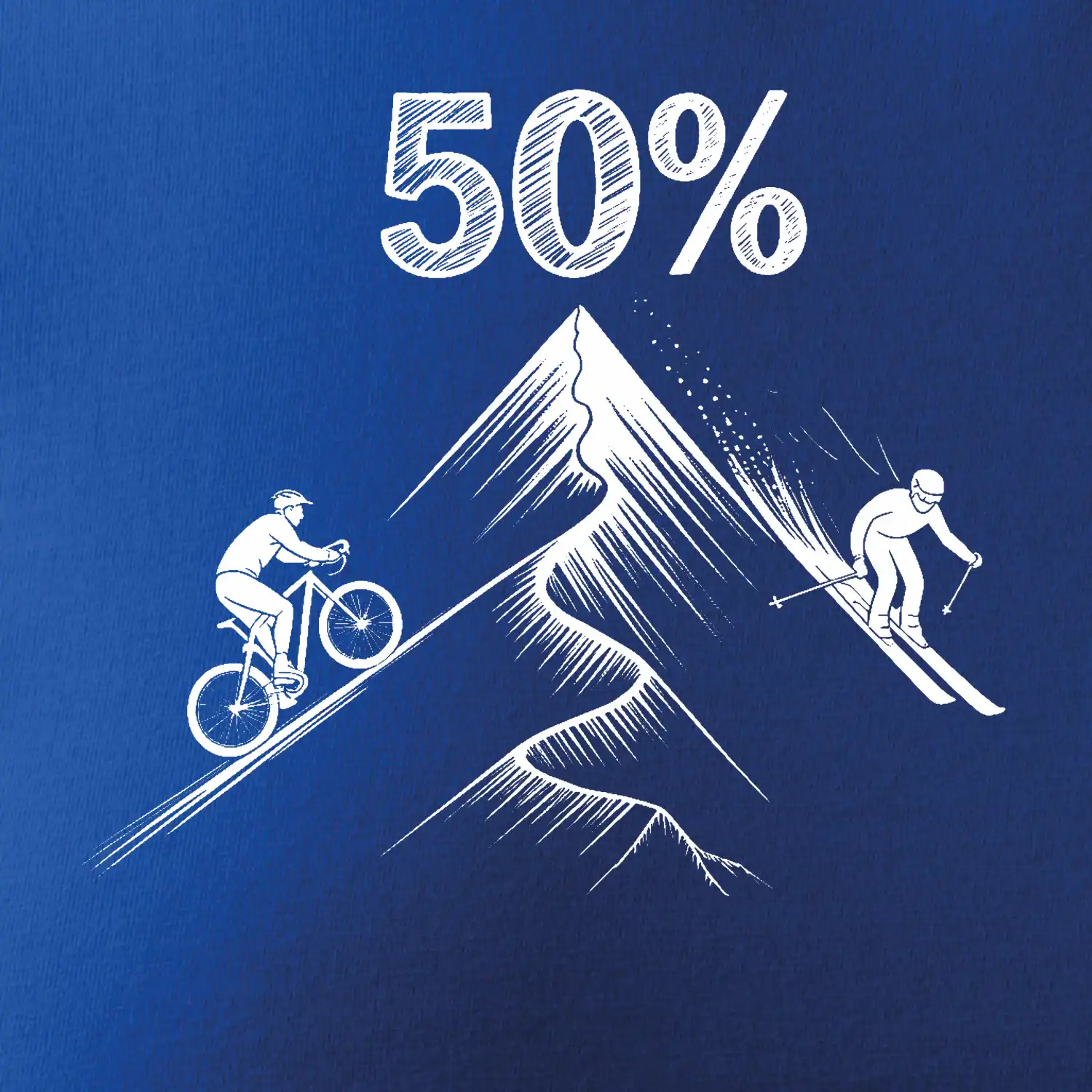 Tento motiv je parádní volba pro každého cyklistu, lyžaře nebo sportovce, který slaví půlstoletí na světě! Středový kruh zdobí výrazná číslice 50, kterou lemují stylizované obrázky kola a lyží – jasná zpráva všem kolem: tahle životní trasa vede přes trail i sjezdovku v plné parádě! Kombinace sportovních symbolů a moderní typografie dodává tričku energii a svěžest, která sluší každému dynamickému oslavenci.