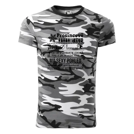 Tričko střední gramáže v barvách camouflage. Střih s bočními švy. Lem průkrčníku ze žebrového úpletu s přídavkem 5 % elastanu. Vnitřní část zadního průkrčníku začištěna páskou v barvě camouflage.